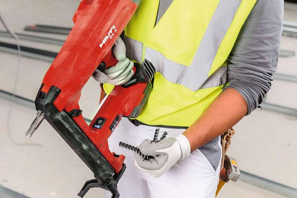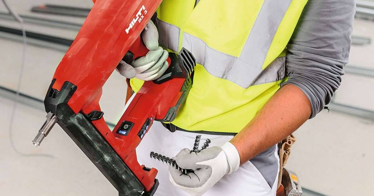 Im Trockenbau werden an einem Tag oft Hunderte von Nägeln gesetzt. Wichtig für die effiziente und qualitativ hochwertige Seriensetzung ist ein flüssiger Arbeitsrhythmus ohne Unterbrechungen. Das Hilti-Befestigungsgerät BX 3 02-L ermöglicht mit seinem 22-Volt-Akku und mechanischem Antrieb eine Setzgeschwindigkeit von 1,3 Hz. Das entspricht bei konstanter Setzqualität mehr als einem Nagel pro Sekunde. So kann man mit nur einer Akku-Ladung bis zu 800 Nägel eintreiben. Ein spezieller Ansetzfuss sorgt dafür, dass die Nägel selbst über Kopf präzise in einem 90°-Winkel gesetzt werden können. Das schlanke Design lässt sogar das Arbeiten in schwer zugänglichen Ecken zu. Erleichtert wird die Arbeit zudem durch das Gerätegewicht von 3,48 kg, einen geringeren Anpressdruck und reduzierten Rückschlag.