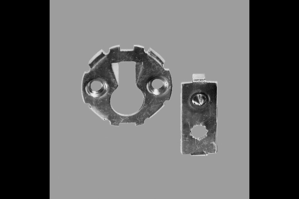 Der «Einhängeverbinder» von Opo und der «Knapp Uno» bestehen aus verzinktem Stahl und werden im Doppel eingebohrt sowie angeschraubt. Das Einhängen geschieht auf einen Schraubenkopf in der Wand. Ein seitliches Schieben ist mit diesen Verbindungen nicht möglich. Alle Einhängebeschläge von Doplex sowie den «Knapp Duo 30» gibt es in einer flexiblen Version mit seitlichem Spiel oder auch spielfrei. Solche Teile sind wichtig, damit ein Türdoppel auch nach vielem Schwinden und Quellen auf dem Träger zentriert bleibt. Ein Aussendoppel an einer Eingangstür hält so alle Spannungen vom gut geschützten Türblatt fern, da es sich von der Mitte aus nach links und rechts bewegen kann.