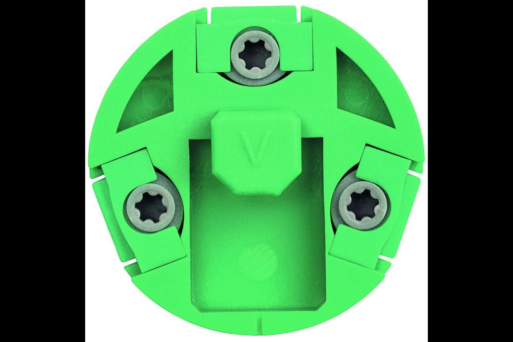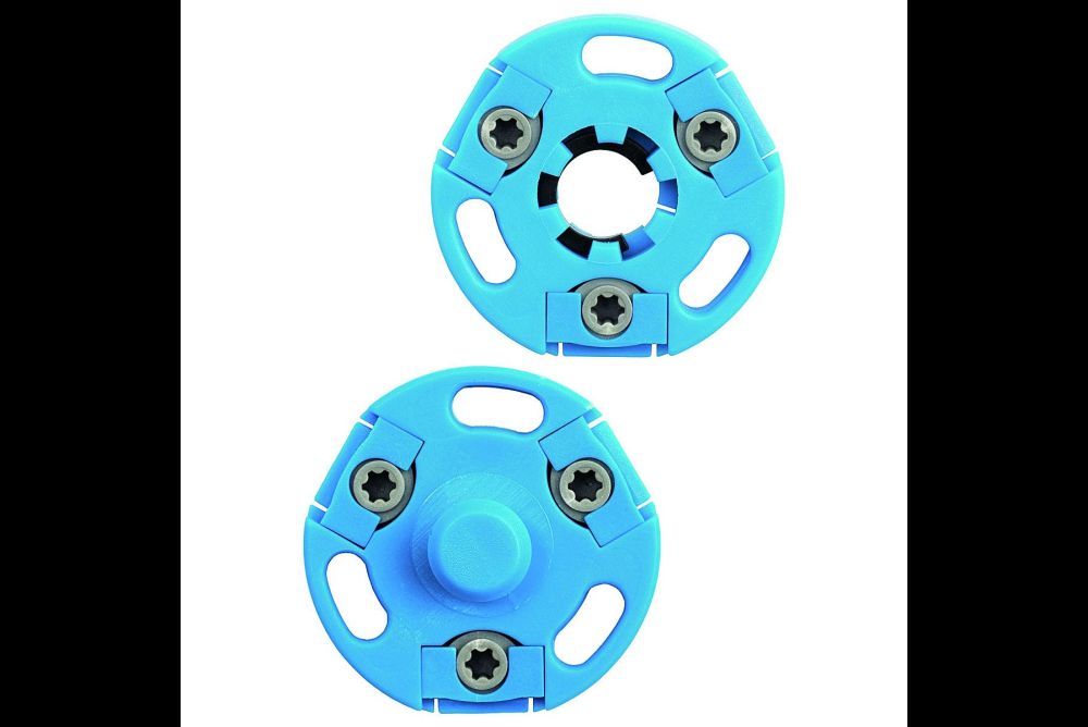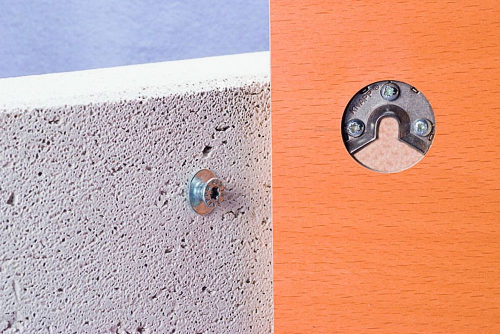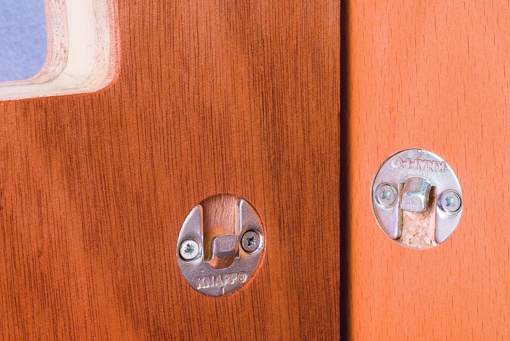 Mit dem «Knapp Duo 35» hat die Firma einen Einhängebeschlag geschaffen, der wie ein Topfband ein Bohrloch mit 35 Millimetern Durchmesser benötigt. Die Schraubenlöcher sind zudem für EuroSchrauben ausgelegt. Auch die «Doplex»Verbinder aus faserverstärktem Kunststoff benutzen in der «Easy»Reihe diesen Durchmesser. Die Bohrtiefe ist zudem mit 6,5 Millimetern gering. Damit die Befestigungsschrauben keinen Einfluss auf die Elementstärke haben, verfügen die Beschläge über drei Spannbacken. Diese fixieren den Beschlag über Exzenterscheiben und Krallen so gut im Loch, dass der Hersteller eine Zugkraft von 50 Kilogramm angibt. Das gilt auch für den wieder lösbaren Druckknopf «Easy Klick». In der flexiblen Variante sind Verschiebungen von 2 Millimetern über 360 Grad möglich – die fixe Version hält das Gewicht.