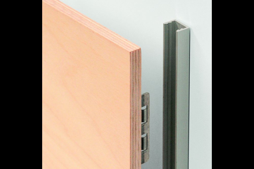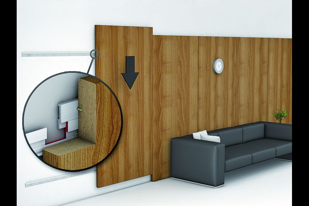 Bei der unsichtbaren Montage von Wandpaneelen kommt schnell einmal der Wunsch auf, keine einzelnen Aufhängepunkte setzen zu müssen. Häfele bietet gleich drei Profilschienensysteme an, die sich deutlich voneinander unterscheiden. Das System «Eilox» besteht aus dem Aluprofil Standard oder Mini mit Lochraster und 2000 Millimeter Länge, welches sowohl an der Wand als auch am Einhängeelement zum Ein satz kommt. Dabei entsteht eingehängt ein Abstand von 5 oder 8 Millimetern und der Einhängeweg beträgt entweder 8 oder 13 Millimeter.
