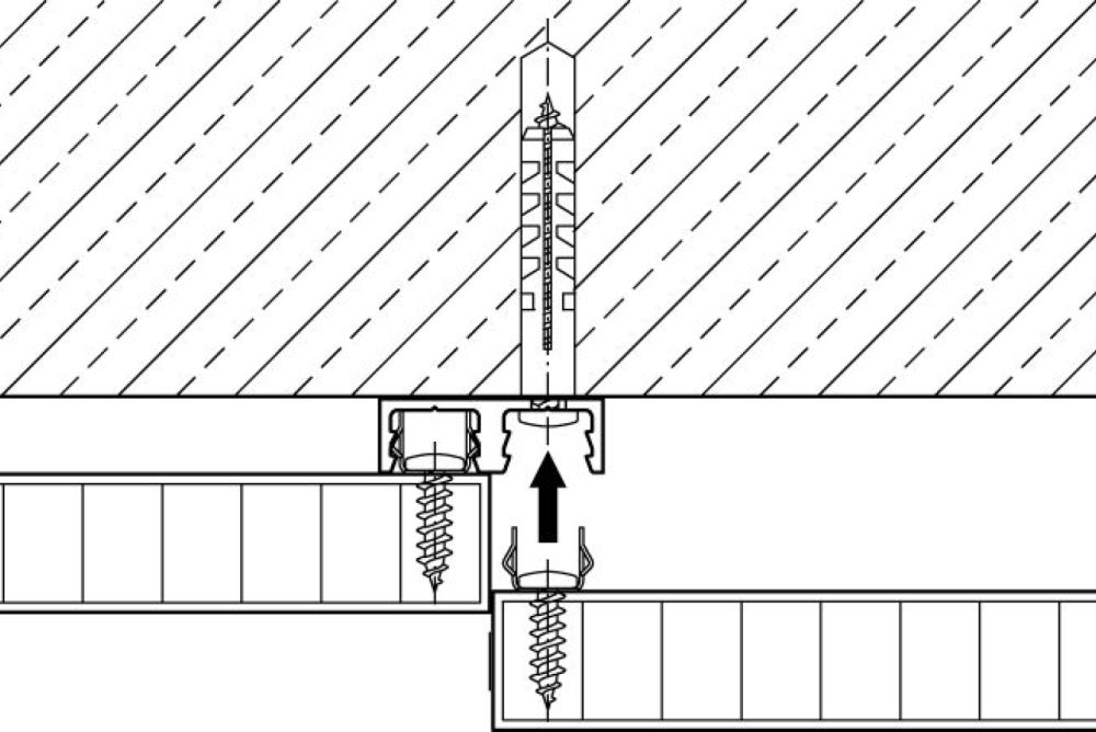 Aus einem 3000 Millimeter langen AluEinfach oder Doppelprofil mit Rückhaltezahnung an den Innenwänden besteht das Klickprofil. Es kann horizontal sowie vertikal an der Wand befestigt werden. Auf den Paneelen werden Montageklips aus Edelstahl mithilfe einer Schablone positioniert und angeschraubt. Es wird eine Basisschiene gesetzt und die weiteren Doppelprofile werden dann fortlaufend mit den Paneelen zusammen montiert.