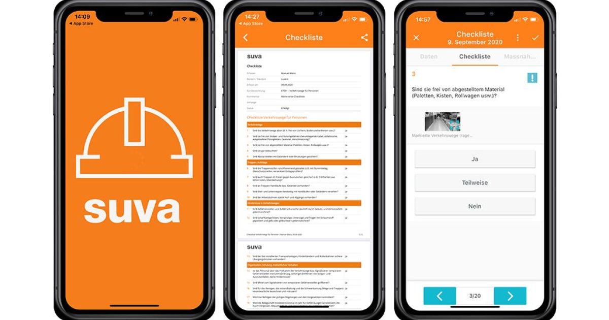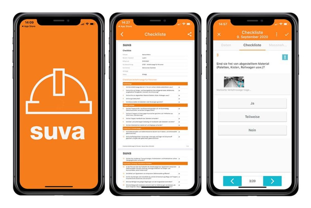 In den Checklisten werden Ja/Nein-Fragen zur gegebenen Situation gestellt. Kann eine Frage nicht mit einem klaren «Ja» beantwortet werden, trifft man direkt vor Ort die notwendigen Gegenmassnahmen. Direkt in der App können den Checklisten Fotos, Notizen oder Sprachmemos angehängt werden. Am Ende einer jeder Checkliste finden sich zudem weiterführende Links der Suva. Ist eine Liste abgeschlossen, wird die gesamte Dokumentation automatisch als PDF-Bericht an die registrierte Emailadresse verschickt.
