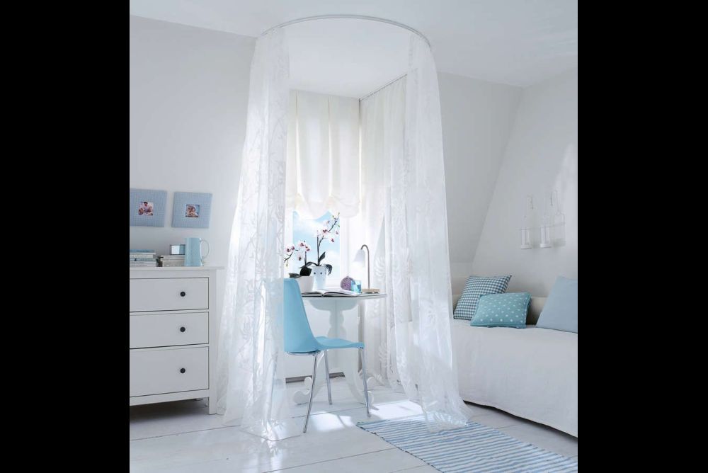Der Idealfall ist, dass die Vorhangschienen gleich in die Decke eingelassen werden. So fallen sie am wenigsten auf, auch wenn sie mal nicht gebraucht werden.