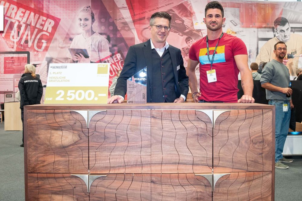 Simone Scozzi (rechts) hat für sein Sideboard den Titel «Schreiner Nachwuchsstar 2022» sowie den Opo-Beschlagspreis gewonnen. Patrick Oeschger, der CEO von Opo, gratuliert ihm. Bild: Beat Baschung