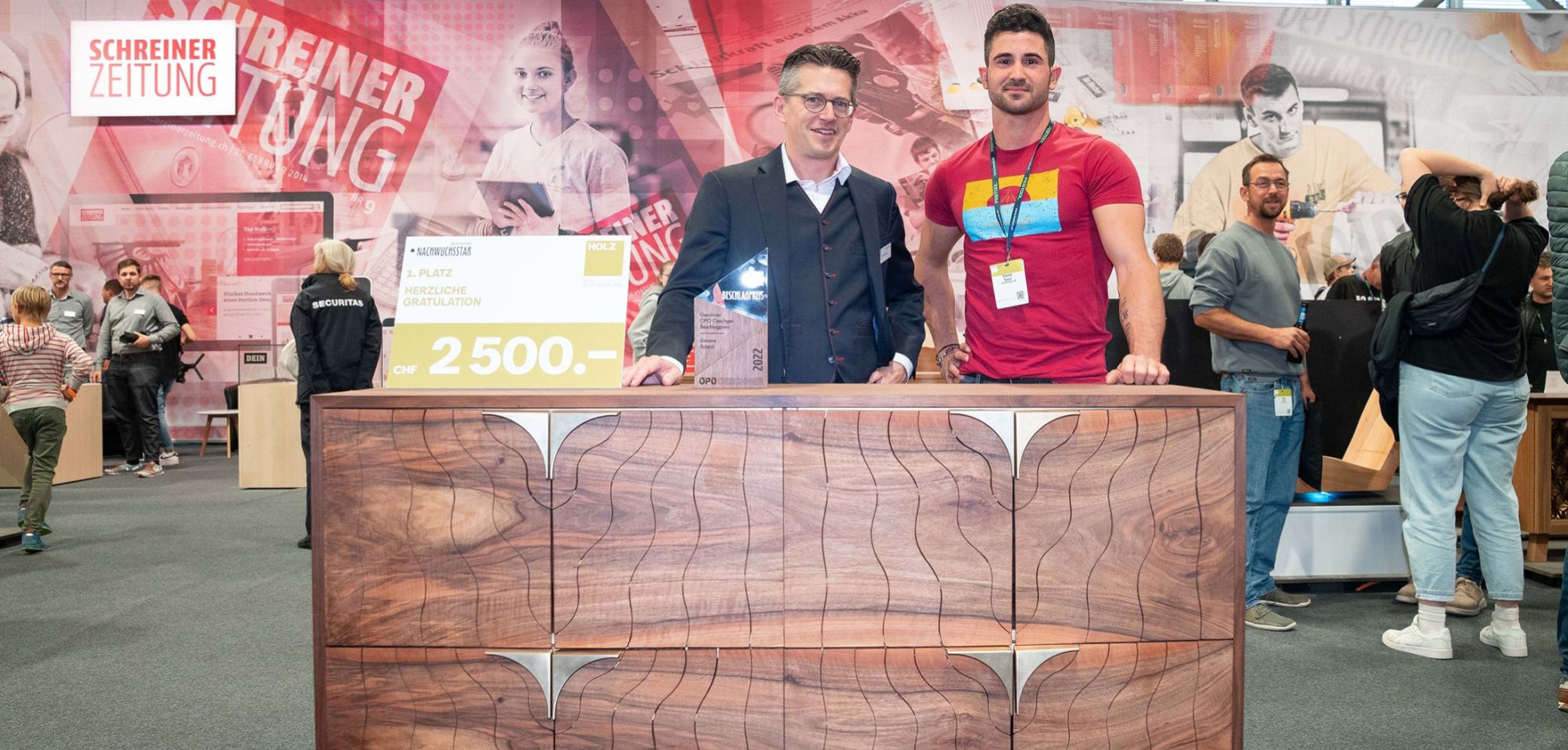 Die Besucherinnen und Besucher der Messe Holz in Basel Mitte Oktober waren sich bei der Wahl des «Schreiner Nachwuchsstars 2022» einig. Mit Abstand am meisten Stimmen erhielt Simone Scozzi aus Leimbach AG für sein Sideboard aus amerikanischem und europäischem Nussbaum mit goldfarbenen Scharnieren und Griffen und mit der speziellen mehrteiligen Faltfront. Und zwar deren 123 von insgesamt 1562 Stimmen. Zur Wahl standen 72 Exponate von Lernenden aus der ganzen Schweiz sowie deren 5 aus Süddeutschland. Welche Objekte in Basel ausgestellt wurden, konnte jede Sektion selbst bestimmen. In der Regel waren dies Möbel, die bei Lernendenwettbewerben in den letzten drei Jahren produziert wurden. Deswegen unterschieden sich die Objekte vom Aussehen und den Dimensionen her, da die Vorgaben der Wettbewerbe unterschiedlich waren.
