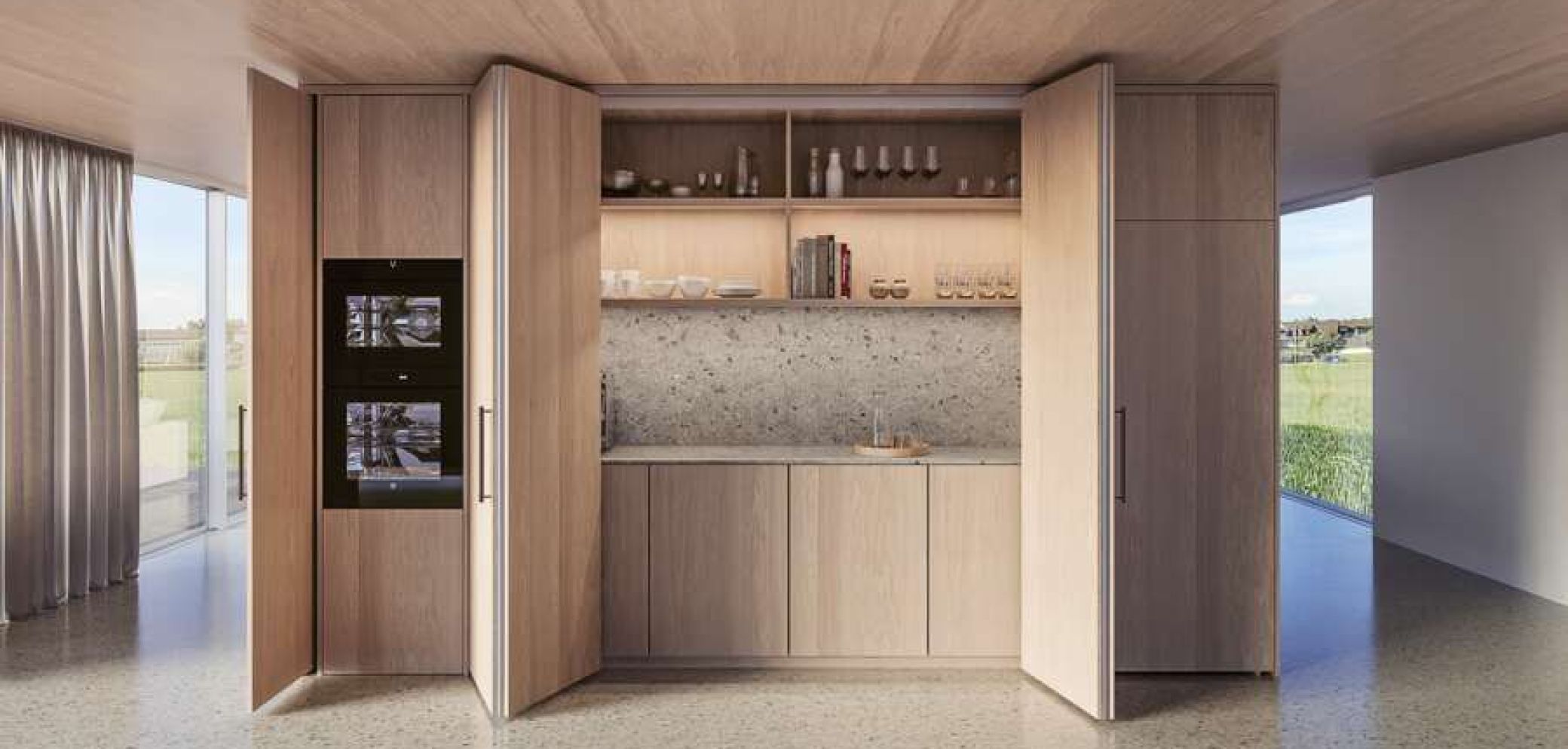Il sistema di ferramenta Hawa Folding Concepta III permette di realizzare frontaliin legno di grandi dimensioni, fino a3 metri di larghezza e 2,70 metri di altezza. Immagine: Hawa