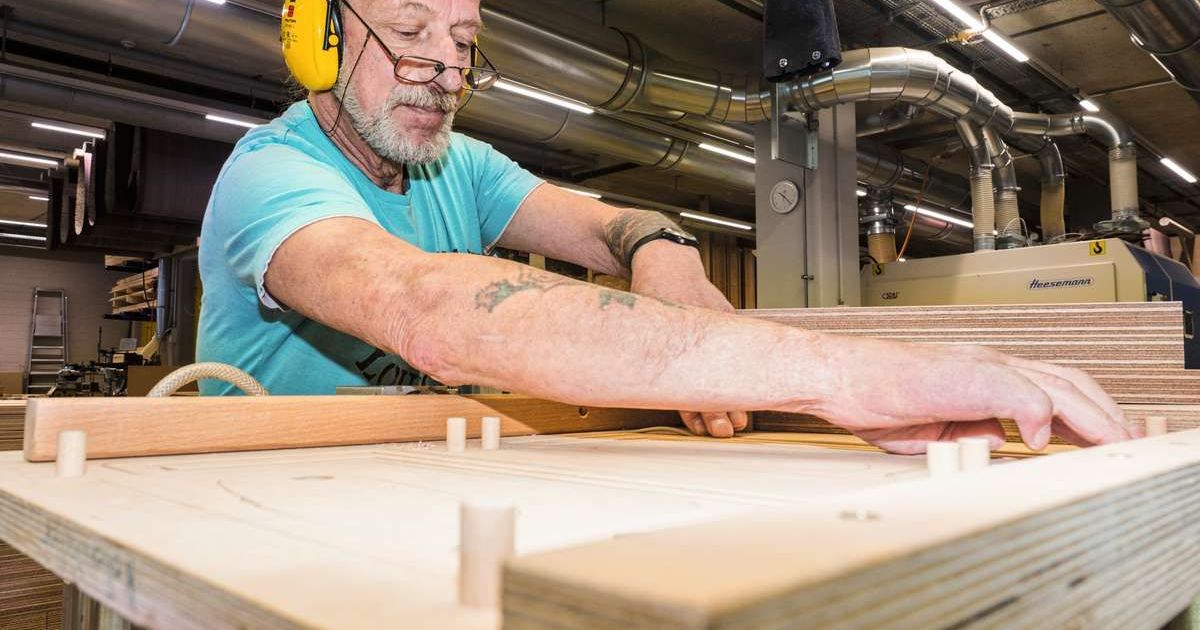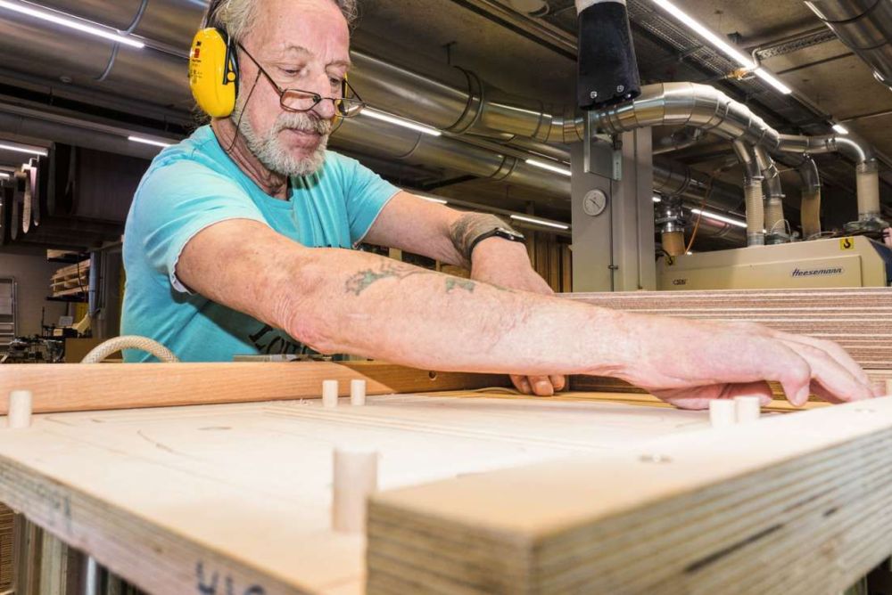 Insgesamt 30 Mitarbeitende und 5 Gruppenleiter arbeiten im Maschinensaal, nochmals so viele im Bankraum ein Stockwerk höher. Dazu kommt die Lehrwerkstatt. Einige der Mitarbeitenden sind körperlich eingeschränkt, sie brauchen zum Beispiel einen Sitzplatz. Andere mögen komplexe Aufgaben, sind aber nach fünf Stunden erschöpft. Wieder andere können nur einen kurzen Arbeitsschritt überblicken. Einige stellen mit grösster Präzision filigrane Kleinteile her, andere schleppen am liebsten schwere Platten, die nächsten leimen geschickt, wieder andere fühlen sich beim Bedienen der Maschinen richtig wohl. Den Produktionsprozess auf die verschiedenen Talente und Bedürfnisse abzustimmen, gestaltet sich mitunter knifflig. Oberstes Gebot: Niemand soll sich unter- oder überfordert fühlen.