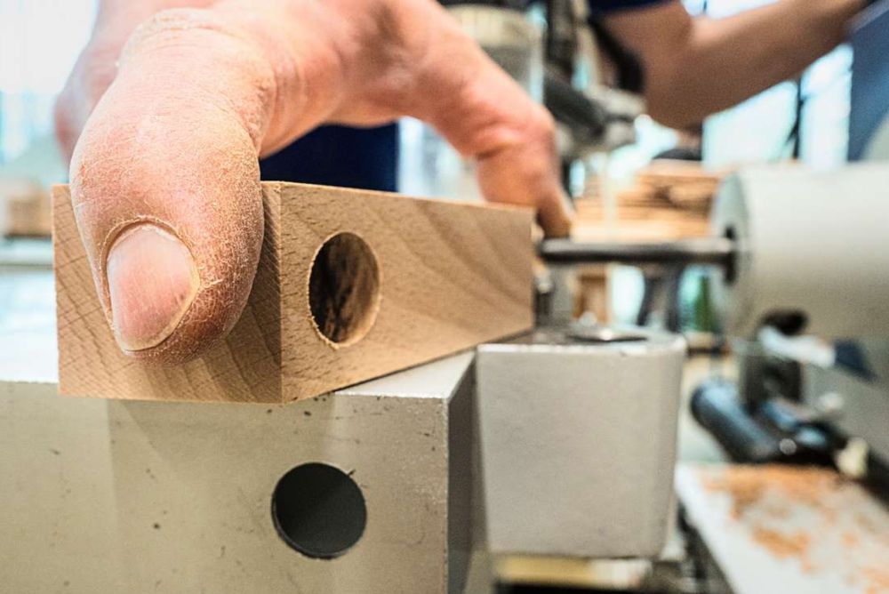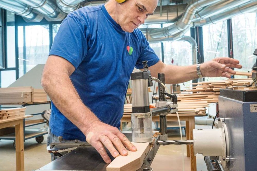Die Pause ist vorbei. Kaum sind die rund 30 Mitarbeitenden mit ihren Gruppenleitern in den Maschinensaal zurückgekehrt, erinnert die Atmosphäre an das emsige Treiben in einem Bienenstock. Hier wird geschliffen, dort gebohrt. Ein Mitarbeiter kontrolliert hoch konzentriert die eben gefertigten Kleinteile, bevor er sie sorgsam in eine Schachtel legt. Sein Kollege stemmt eine schwere Holzplatte auf die Beige, ein anderer stellt die Säge ein, wieder ein anderer wechselt Sägeblätter. Die Maschinen rattern, gelb leuchten die Gehörschütze; es riecht nach Holz. Auf den ersten Blick ist es ein ganz gewöhnlicher Dienstagmorgen in einer ganz gewöhnlichen Schreinerei.