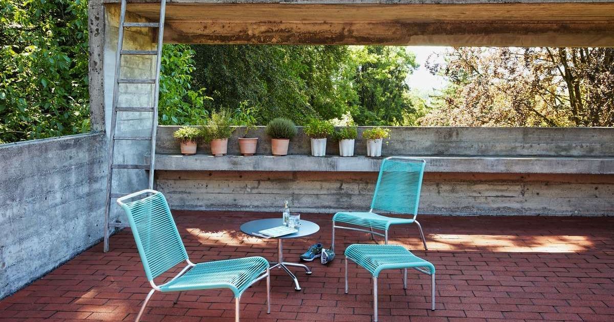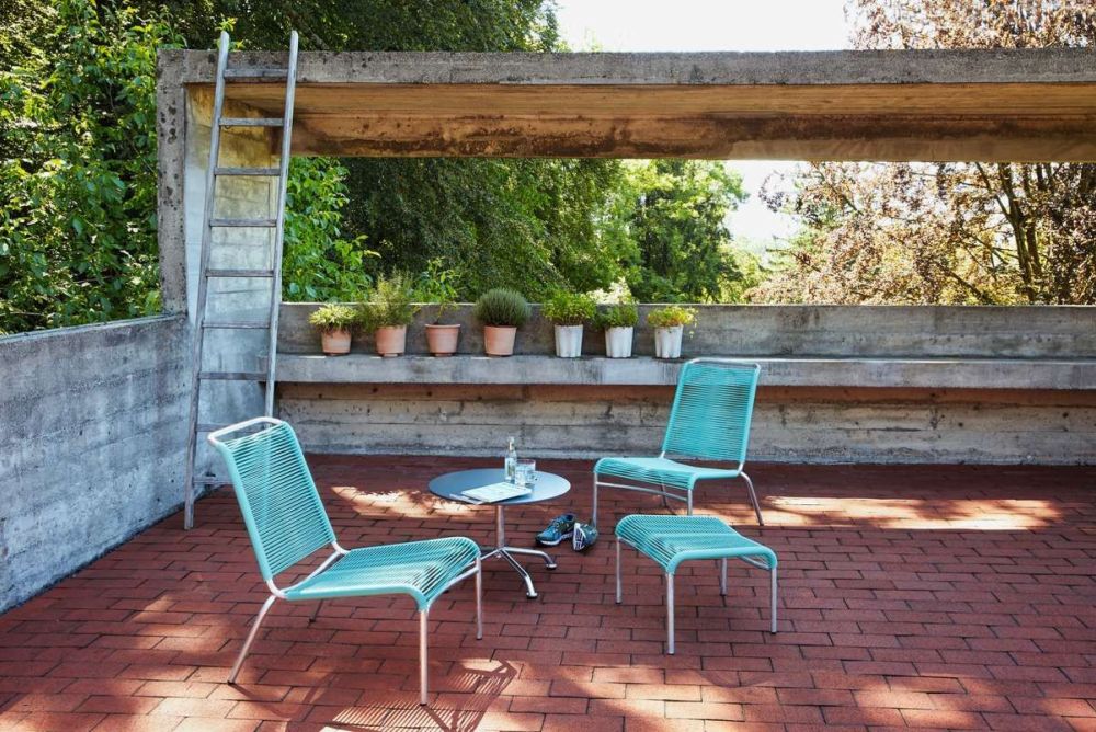 Embru in Rüti ZH stellt den «Altorfer Stuhl» her, den wetterfesten Schweizer Designklassiker mit den farbigen Kunststoffschnüren von Huldreich Altorfer. Dem Trend zu tieferen, breiteren Outdoor-Möbeln entsprechend, produziert das Unter- nehmen den Klassiker wieder in der beque- men Loungeversion, auch in der Version mit Armlehnen. Besonders zeitgemäss ist der «Spaghetti-Lounger» in den Pastelltönen Lichtgrün, Altrosa und Grau.