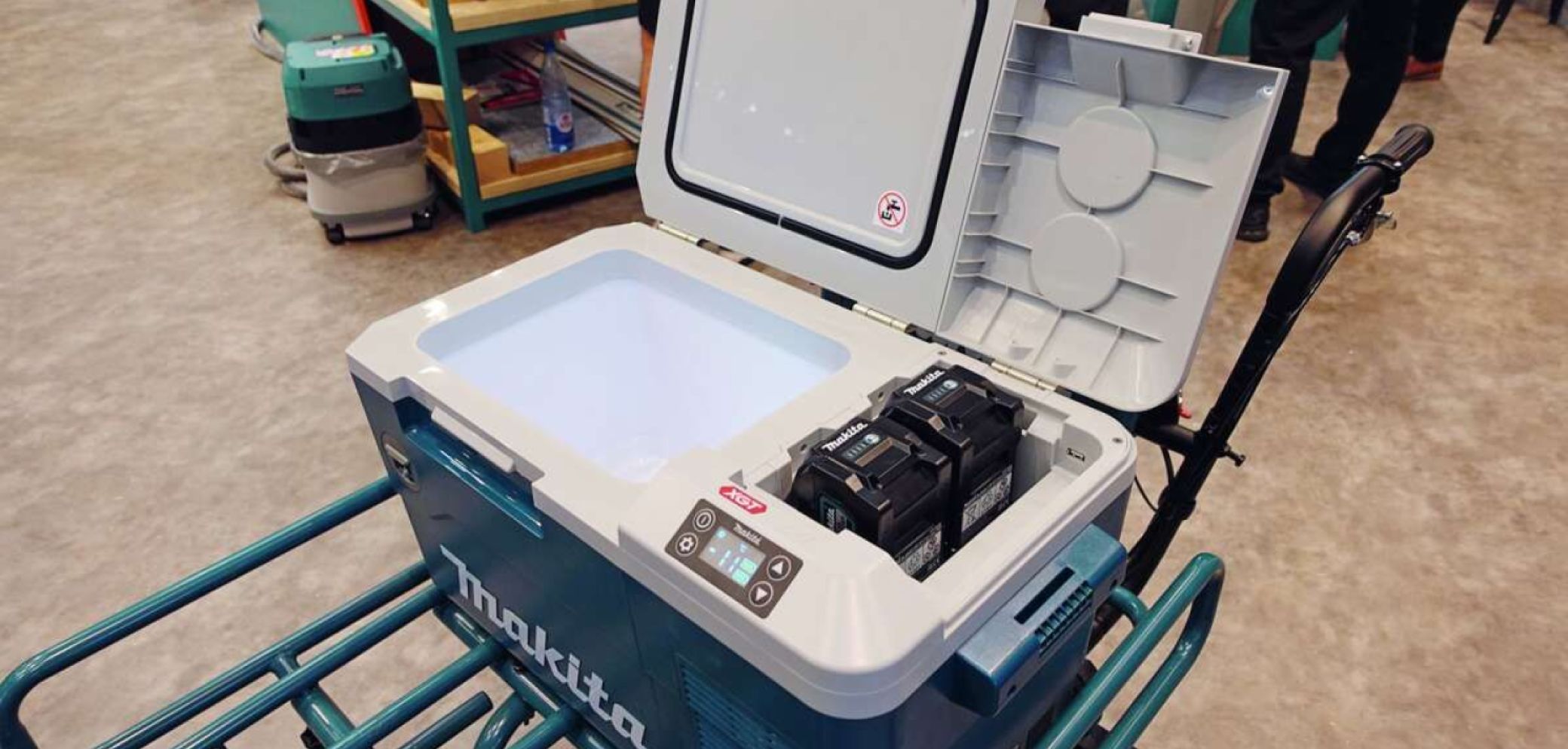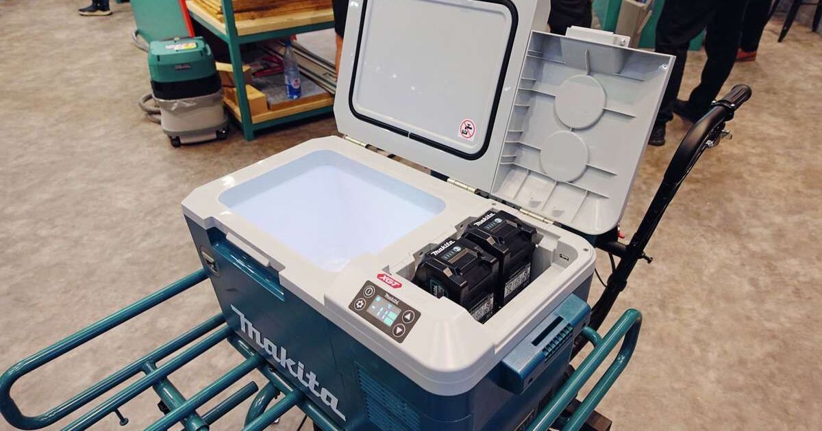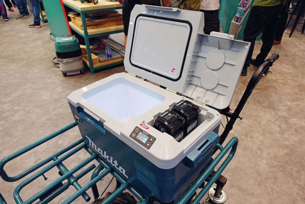 Makita hat wortwörtlich an alles, was möglich ist, einen Akku gehängt. So zeigte das Unternehmen auf seinem Messestand unter anderem eine Kühlbox (Bild), einen Wasserkocher, eine Kaffeemaschine und einen Schubkarren mit Licht. Makita stellte auf dem Stand das ganze Akku-Sor- timent zum Testen zur Verfügung.