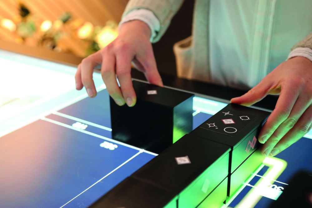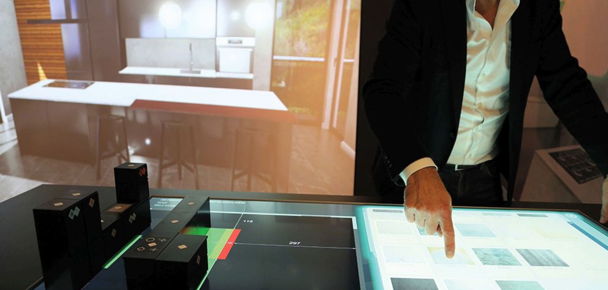 «Touch Reality» hilft bei der Verwirklichung der Traumküche. Basierend auf dem Raumkonzept des Kunden werden die Küchenteile in Form von Baumodulen auf den Visualisierungstisch gelegt. Auf dem Touchscreen können die Elemente verschoben, farblich verändert, in ihrer Form angepasst und mit Griffen oder Geräten ausgestattet werden – das Ergebnis wird sofort auf dem grossen Display in 3D visualisiert.