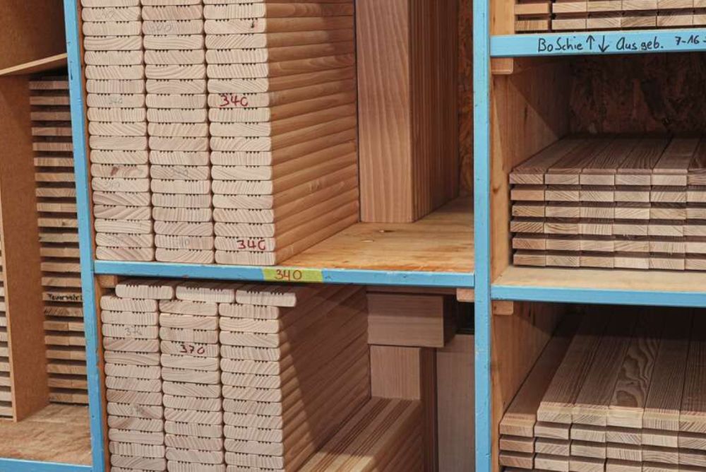 «Das Material können wir gut vorproduzieren, wenn wir mal etwas weniger Arbeit haben, was für uns natürlich sehr praktisch ist», sagt Huser. Die Sprossen und Tritte haben bestimmte Standardmasse, was die Produktion wie auch die Lagerung vereinfacht. «Die Holme sollen möglichst gerade sein und keine auslaufende Jahrringe haben, das gibt ihnen die nötige Stabilität», sagt Huser und erklärt auch den Unterschied von Sprossen zu Tritten: «Eine Sprosse ist eine hochkant verbaute Leiste, die gegenüber einem breiten Tritt wesentlich stabiler im Durchbiegeverhalten ist.»