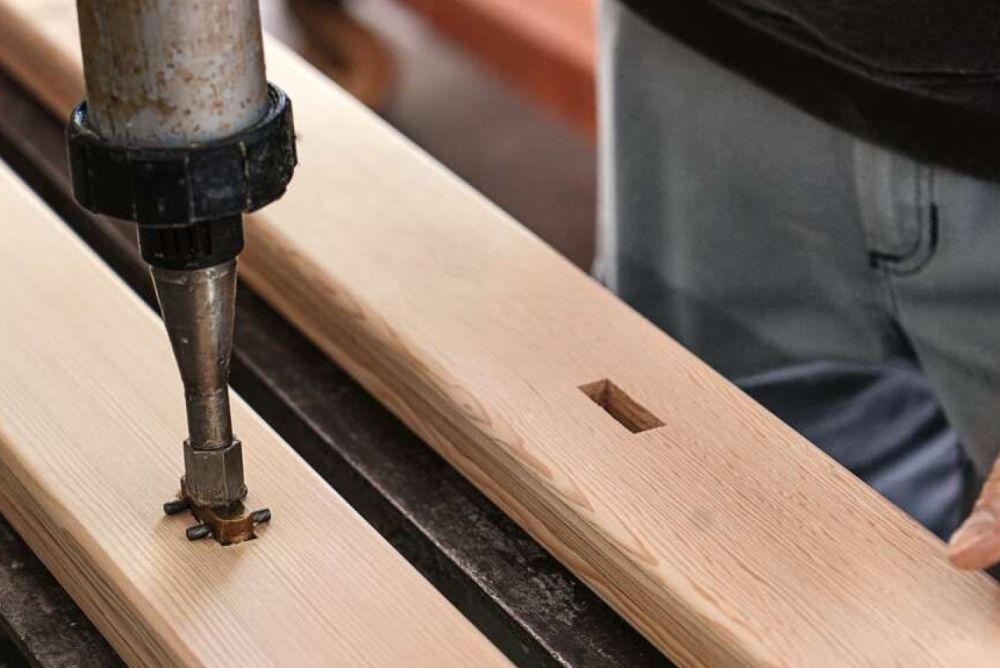 Steht fest, welches Modell produziert wird, legt der Angestellte René Knecht die benötigten Holme und Sprossen auf dem massiven, fahrbaren Werktisch bereit. Dann spritzt Knecht mit der Druckluftpistole und einer speziellen Auftragsdüse den PUR-Klebstoff in die Sprossenlöcher. Die Düse ermöglicht einen schnellen, praktischen und gleichmässigen Klebstoffauftrag. Anschliessend werden im ersten Holm die Sprossen eingeschlagen, der zweite Holm aufgesteckt und das Ganze wiederholt. Nun kommt die Leiter in die Pneumatikpresse, welche die Sprossen richtig mit den Holmen verpresst. Damit sich die Sprossen nach der kurzen Presszeit nicht wieder aus den Holmen lösen, wird an jeder zweiten Sprosse ein Nagel eingeschossen.