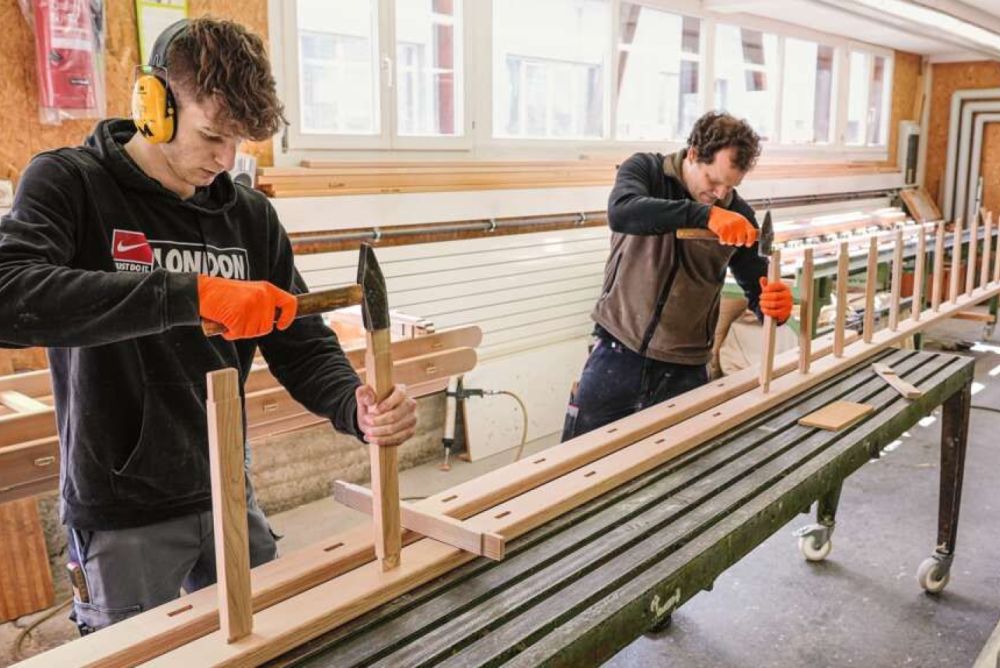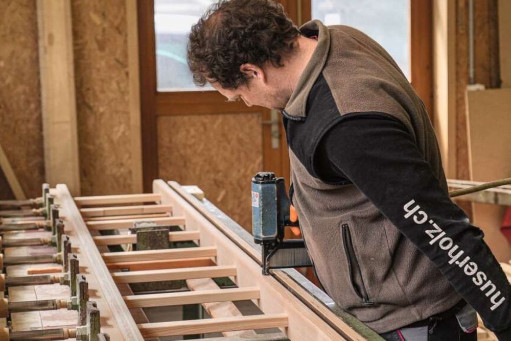 Von aussen macht die Huser Schreinerei im aargauischen Niederrohrdorf einen unauffälligen Eindruck und fügt sich gut ins Ortsbild ein. Betritt man aber die Werkstatt, deuten die liegende Pneumatikpresse und die vielen, fein säuberlich vorbereiteten Sprossen darauf hin, dass hier neben Möbeln noch Spezielles hergestellt wird: handgefertigte Holzleitern. «Durch Zufall sind wir zur Leiternproduktion gekommen. Anfänglich waren wir lediglich die Vertretung von Oehen Leitern. Nachdem sie aber den Betrieb einstellten, konnten wir die Produktion übernehmen», erzählt Rico Huser, Inhaber und Geschäftsführer der Huser Schreinerei.