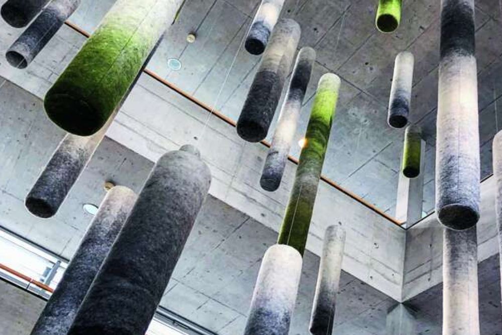 Dass die Schallabsorption nicht zwingend im Hintergrund stehen muss, sondern auch ein ästhetischer Blickfang sein kann, zeigen die Akustikzylinder Lina by Kula der Firma Bellton AG in Kriens LU. Die nachhaltigen und von Hand produzierten Absorber der isländischen Designerin Bryndis Bolladottir bestehen in der äussersten Schicht aus isländischer Schafwolle. Das Naturprodukt hilft, Schadstoffe und Gerüche in der Luft zu neutralisieren und ein gutes Raumklima zu schaffen. Die Akustikzylinder sind selbstreinigend sowie brandschutzgeprüft. Gerade bei hohen, offenen Räumen eignen sie sich hervorragend, um die Schallreflexionen zu schlucken. Gutes Beispiel hierfür ist die Reha-Klinik in Rheinfelden AG: Dort wurden insgesamt 48 zylindrische Absorber in drei verschiedenen Längen montiert. Deckenhängend an Stahlseilen, wurden diese mithilfe eines Lasers genau positioniert und angebracht. Dem Kunden wurde vorab eine Visualisierung präsentiert, was für ihn ein Muss war, um sich die Lösung vorstellen zu können. Ein weiteres, für den Schreiner interessantes Produkt bietet die Bellton AG mit dem Halbfabrikat Echoboard an. Die in 12 oder 24 mm erhältlichen Absorberplatten bestehen aus rezykliertem PET und können in diversen Farben, auf Mass genau oder in den vorgegebenen Plattendimensionen bestellt werden. Sie sind leichtgewichtig, einfach zu schneiden und zu montieren. Mittels Kontaktsprühkleber lassen sich diese auch gut aufkleben und bilden mit der Trägerplatte somit eine gute Absorptionsmöglichkeit.