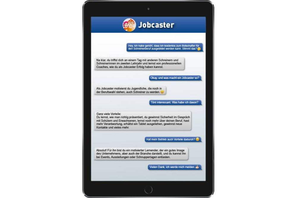 Jobcaster. Es sind wieder Botschafter für den Schreinerberuf gesucht. Die Jobcaster haben die Aufgabe Schülerinnen und Schüler in der Phase der Berufswahl für den Schreinerberuf zu begeistern.