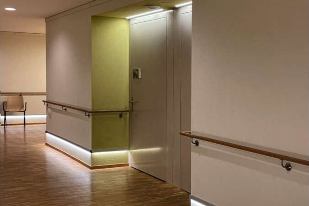 Mit dem gleichen Prinzip wie bei der Wegleitung in Flugzeugen lassen sich auch Gänge in Gebäuden beleuchten und sicherer machen. Die Korridore der Demenzstation des Alterszentrums Scheidegg in Herzogenbuchsee BE wurden mit einem solchen Leitsystem ausgestattet, das den Bewohnern hilft, sich besser zu orientieren. Die indirekte Korridor-Beleuchtung hat die Firma Aka Leuchten AG in Niederbipp BE mithilfe von massgefertigten Aluminiumprofilen umgesetzt. Die Montagehöhe von 30 Zentimetern ab Boden und die Abstrahlung nach unten wurde bewusst gewählt, da sich Menschen mit Beeinträchtigungen langsamer bewegen und sich eher am Boden als an der Decke oder Wänden orientieren.
