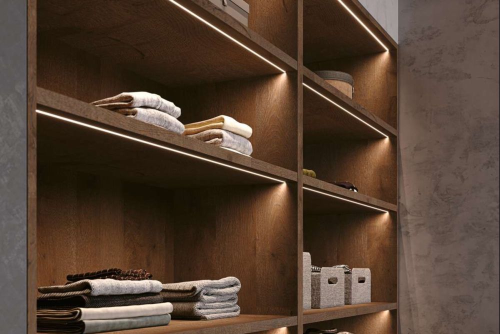 Das Licht lässt sich dimmen und die Farbtemperatur stufenlos zwischen 2700–6500 K einstellen. Die Betriebsspannung beträgt 12 V, die LED-Bänder haben auf beiden Seiten eine Zuleitung. Das Profil ist in den Längen 1200, 2400 sowie 3600 mm lieferbar und weist an der Unterseite eine spezielle Nut auf. Dank dieser lassen sich Zubehörteile wie Haken, Halter und Ablagen einhängen. Für das Profil sind kompatible, schwarze Aluminium-Regalmodule in unterschiedlichen Dimensionen erhältlich. Die 150 mm tiefen Regale passen dank der Ausklingung an der Wandseite mit dem Profil zusammen.
