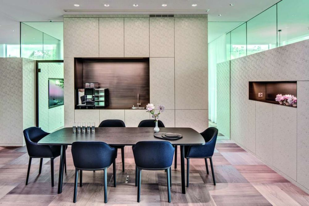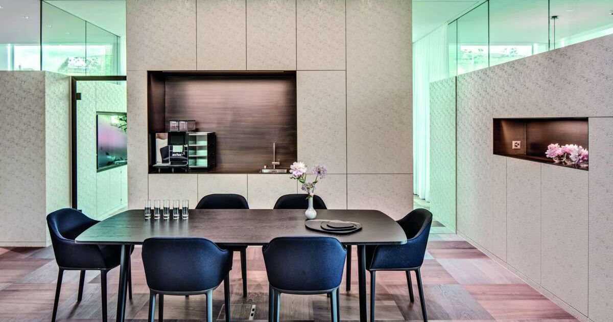 Dank einer Restrukturierung erinnern die drei Standorte der Raiffeisenbank Region Zofingen AG an die Anfangszeiten der Bank, in denen die Kunden ihre Geschäfte noch in der privaten Stube des Bankiers bei einer Tasse Kaffee abwickelten. Die Grundrisse der Gebäude wurden durch Raummodule gegliedert. Diese stehen in funktionaler Hinsicht im Zentrum des Konzepts und prägen durch ihre Ausgestaltung den Charakter der «Stubenbank». Die Oberfläche der Module erinnert mit ihrem filigranen Blumenmotiv an eine Tapete. Tatsächlich handelt es sich um MDF-Platten, welche mit dem vom Berner Oberländer Unternehmen Strasserthun entwickelten Lasersublimationsverfahren «Sublidot» veredelt wurden. Dabei wird das zu bearbeitende Plattenmaterial mittels Laserstrahl punktgenau und nach grafischer Vorlage verdampft. Mit dem berührungslosen Verfahren lassen sich grossflächige dreidimensionale Muster in absoluter Präzision produzieren. Die Module mit dem feinen Muster und der hellen Farblackierung stehen für den heimeligen «Stubencharakter», während die mit Bronze ausgekleideten Nischen für ein edles Erscheinungsbild sorgen.