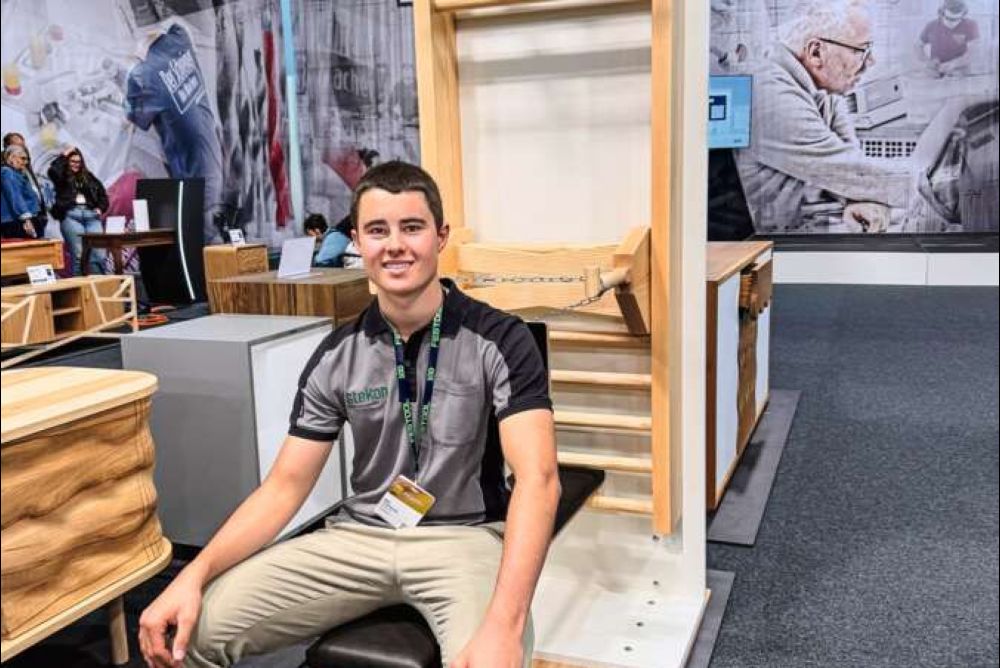 Der 18-jährige Mike Frischknecht aus St.Gallenkappel ist im dritten Lehrjahr bei der Stekon AG in Eschenbach SG. Er baute eine Sprossenwand für zu Hause. «Im Fitnesscenter ist man immer an Regeln und Geräte gebunden. Ich wollte etwas Eigenes, mit dem ich unabhängig trainieren kann.» Die Trainingswand besteht aus sechs Eschenbrettern. «Ich musste auf den Jahrringverlauf achten, damit das Holz sich nicht verzieht oder reisst», erklärt er. Die Trainingselemente lassen sich aushängen, um am Boden zu trainieren oder Dehnungsbänder zu befestigen. Die Polsterung fertigte Frischknecht selbst mithilfe einer Polsterei. «Alles habe ich von Hand gemacht, die CNC kam nicht zum Einsatz», sagt der angehende Schreiner stolz.
