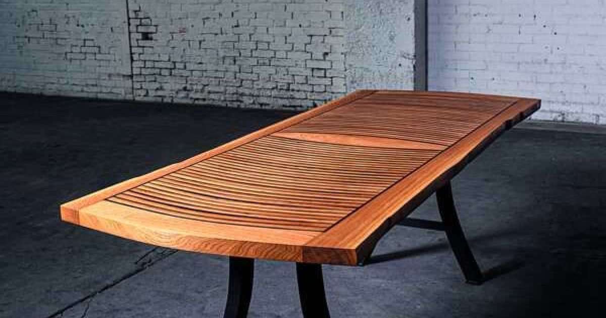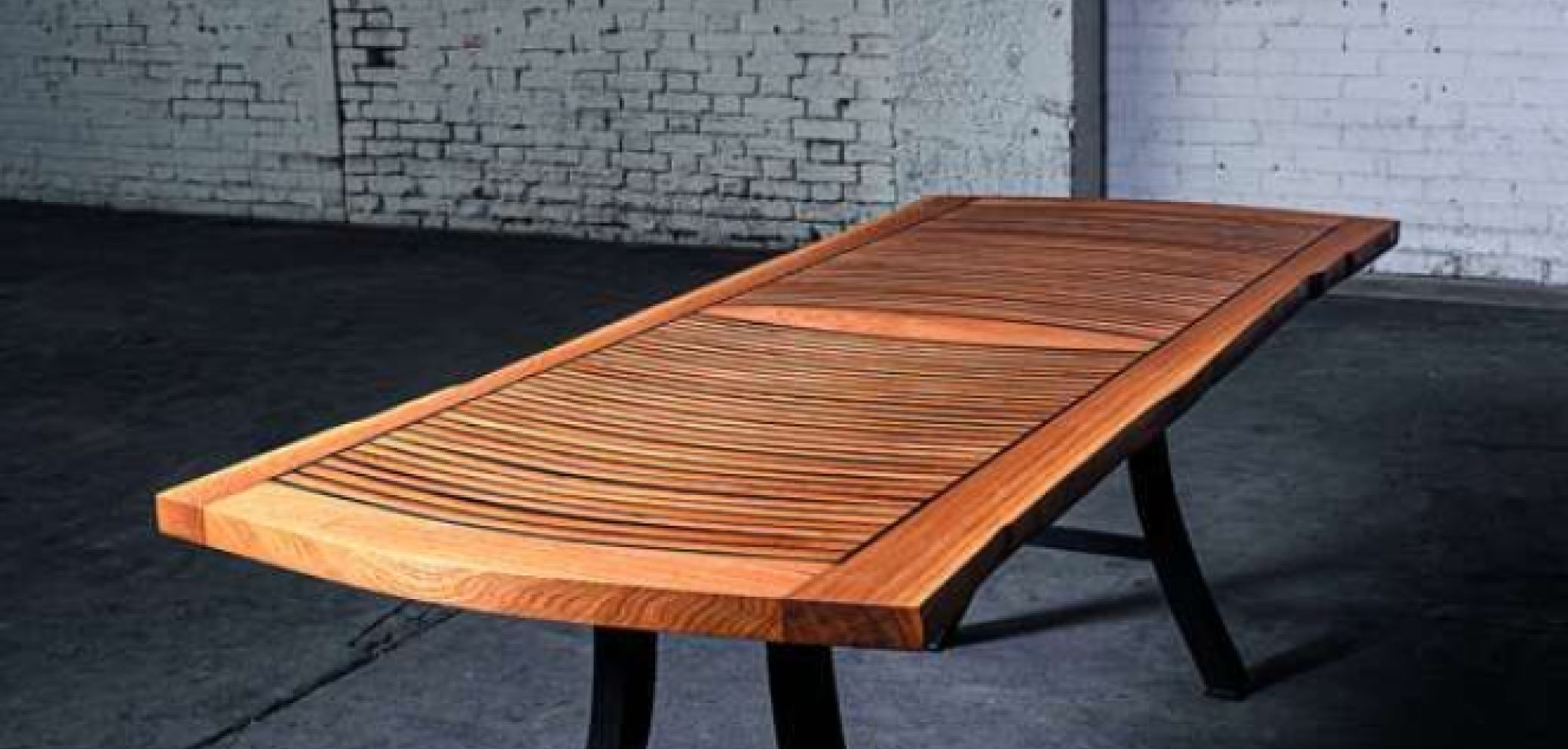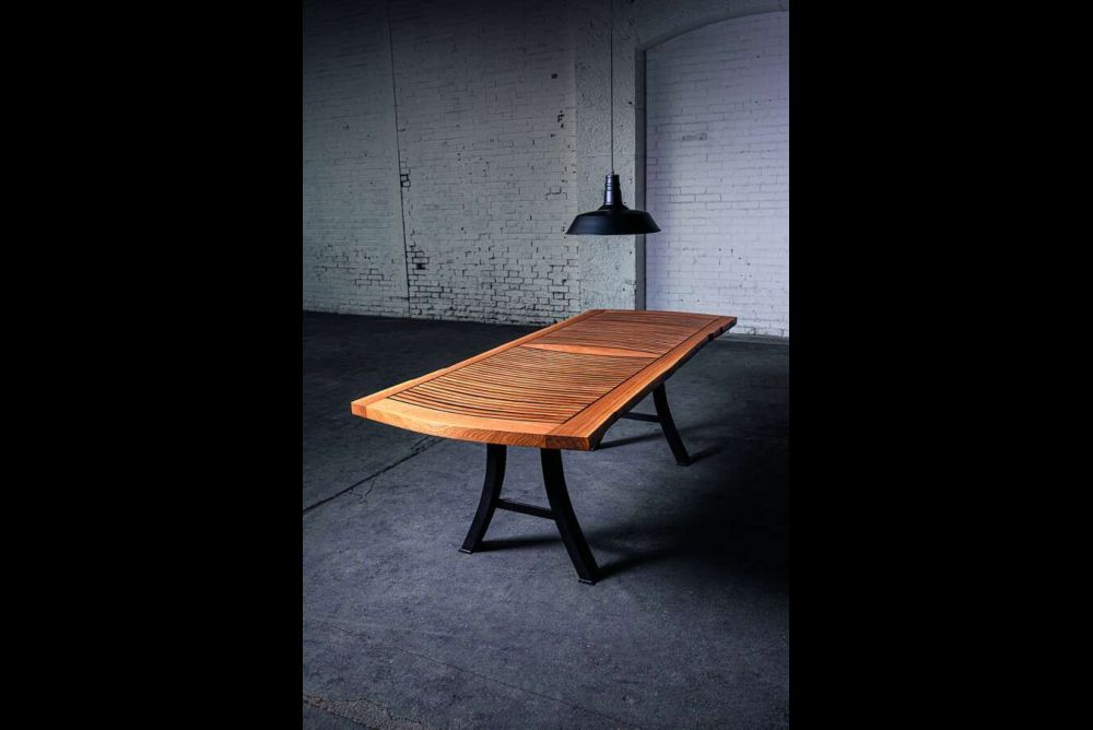 Der Esstisch Maximus besteht aus gebrauchten Dauben von Burgunderfässern. Bild: Fasswerk Hämmerle