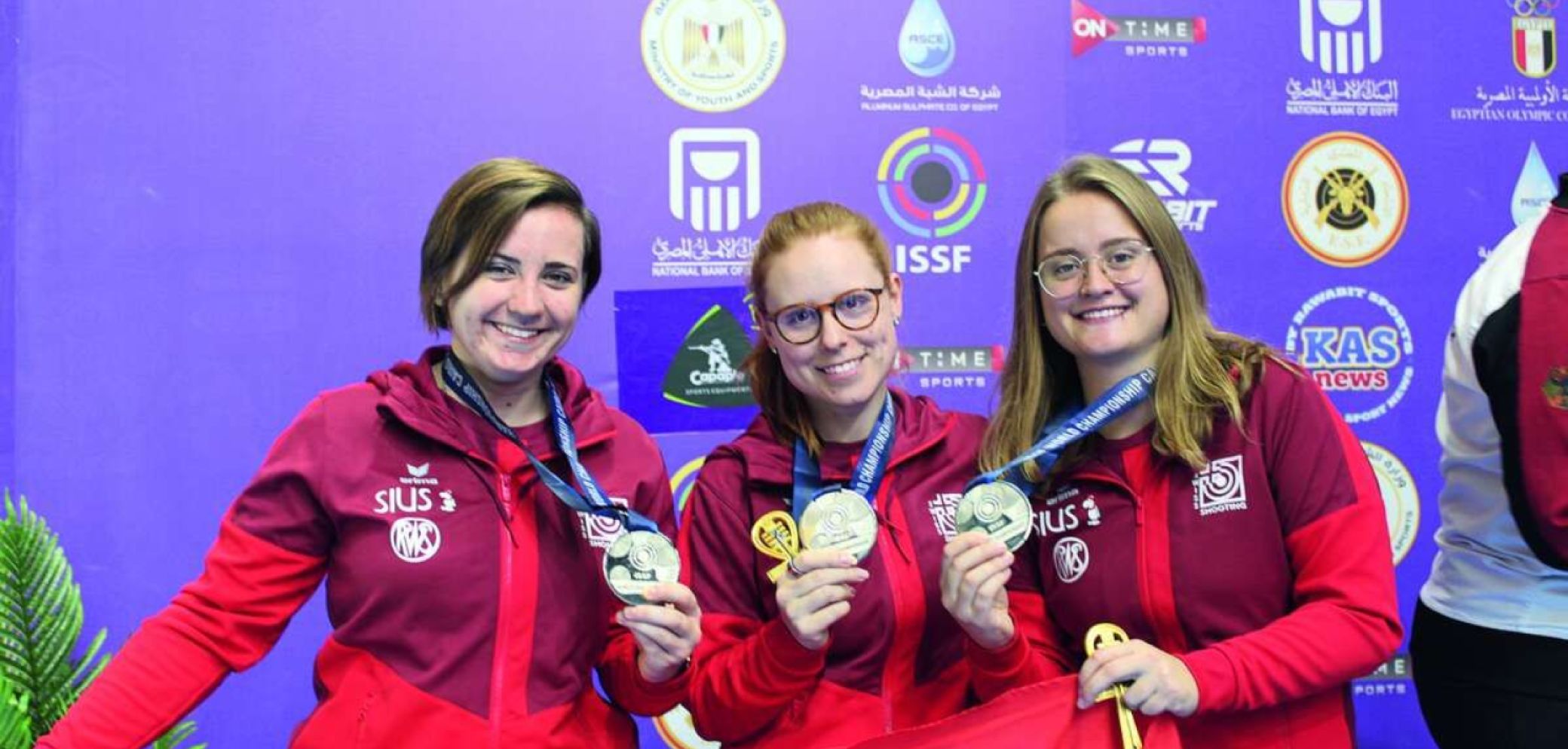 Überlicherweise arbeitet Sarina Hitz bei der Meier Schreinerei AG in Weinfelden TG. Doch derzeit weilt die 22-Jährige aus Mauren TG in Kairo (Ägypten) an der Schiess-WM. Denn Hitz ist passionierte und erfolgreiche Schützin. An der WM hat sie zwei Silbermedaillen gewonnen. Zuerst im Einzel mit dem Gewehr über 50 Meter liegend. Dann holte sich Hitz mit Nina Christen und Franziska Stark (Bild, v. l.) im Team-Wettkampf mit dem Gewehr im Dreistellungsmatch über 50 Meter erneut Silber. Das Trio musste sich nur den Deutschen geschlagen geben. In der Disziplin Liegend Mixed wurde Hitz mit Christoph Dürr Fünfte. Die Freude über die Medaillen ist bei Sarina Hitz gross. «Vor allem die Einzelmedaille kam für mich überraschend», sagt sie. Vor sechs Wochen hatte sie an der EM in Polen schon unerwartet Bronze gewonnen, doch die WM sei ja nochmals eine grössere Nummer.