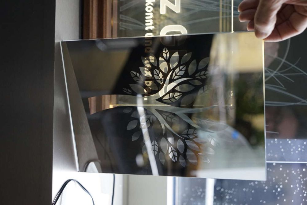 Lasergravuren schaffen im Glas eingeschlossene Buch-stabenblöcke, die je nach Licht leuchten. Bild: Galvolux SA