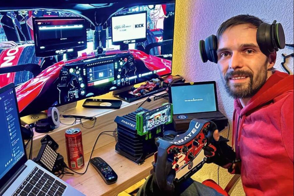 Schreiner Kevin Tix (36) begeistert sich für virtuelle Formel-1-Rennen. Das Cockpit baut er sich selbst. Bild: Beatrix Bächtold