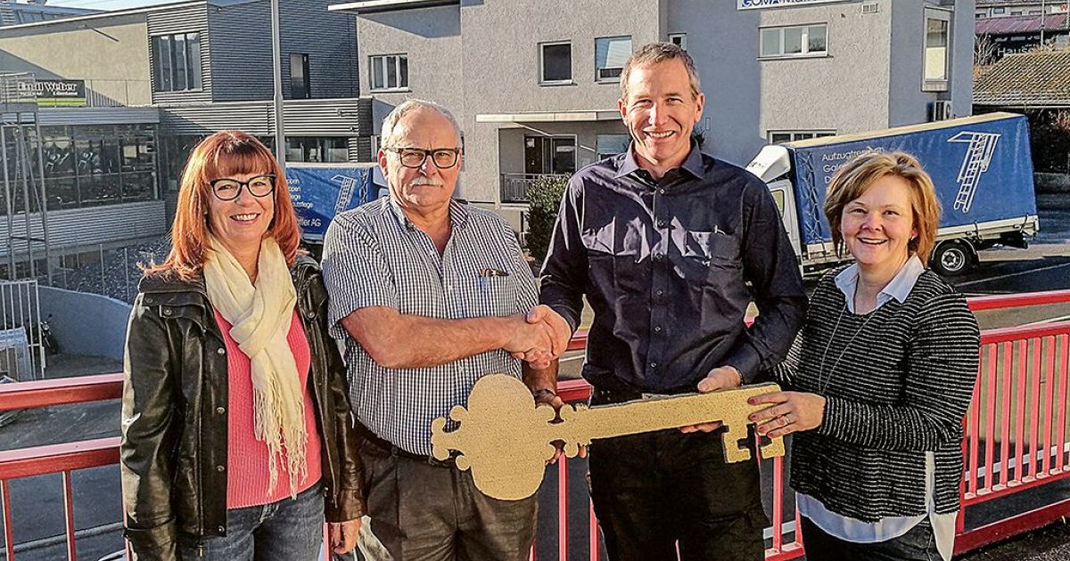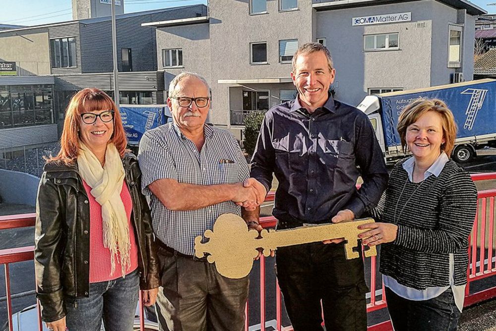 Theophil Matter (2.v.l.) überreicht Sven Müller symbolisch den Schlüssel. Bild: Goma Matter AG