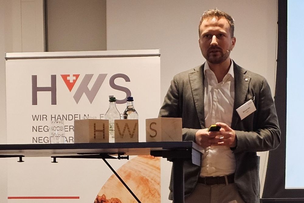 Mit dem Thema Reuse, also Wiederverwertung kam Quentin Gurba, Produktionsleiter der Artibois SA in Alle JU auf eine der Säulen des HWS-Hauses – die Nachhaltigkeit zurück. Er berichtete, wie ausgemusterte Paletten im Rahmen des Projektes «EcoCheeseWood» zu Holzriemen für den Innenausbau verarbeitet werden.