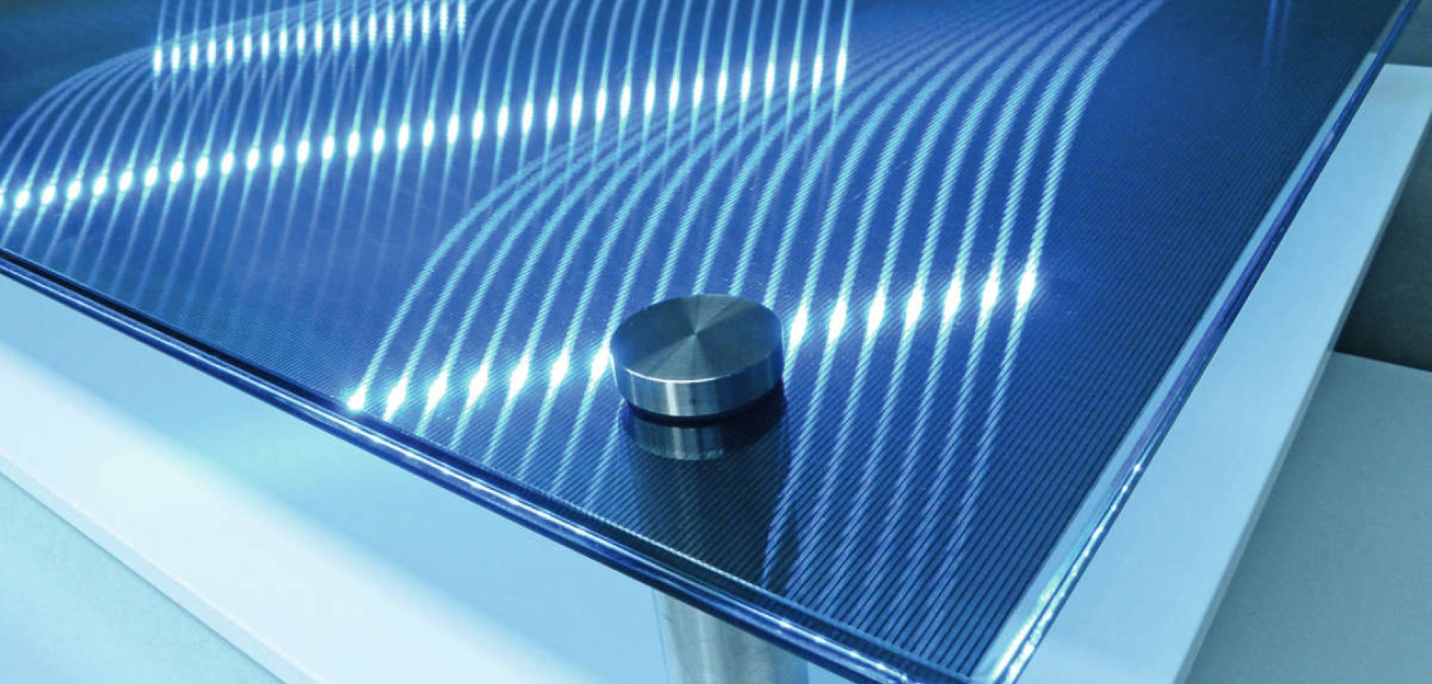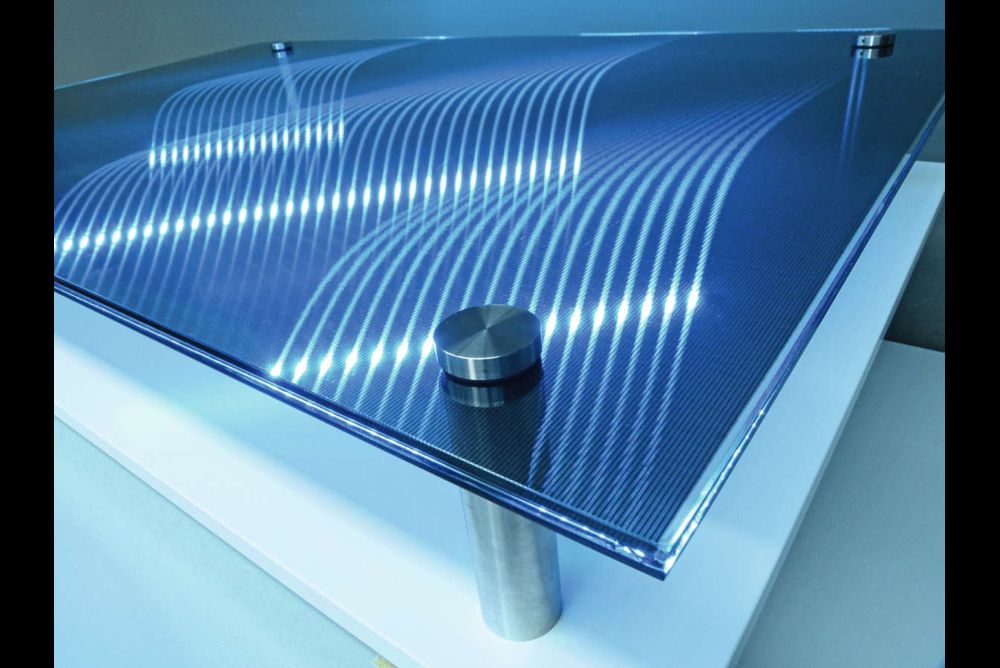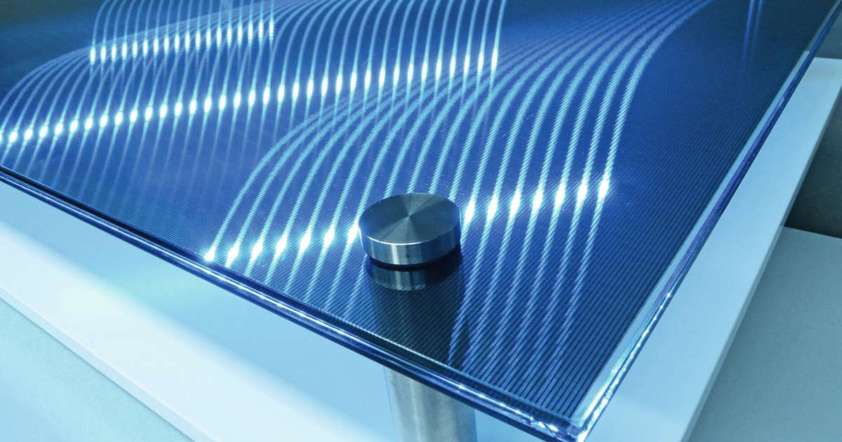 Flachglas Schweiz bietet mit «vetroLoom» die Möglichkeit, die Oberflächenoptik von hochwertigem Glas mit Lichtstrukturen zu verbinden. Die dreidimensionalen Lichteffekte werden hier durch Einbettung des lichttechnischen Gewebes in ein Verbundglas erzielt. Wird das Gewebe von LED-Licht durchleuchtet, entstehen unterschiedliche Lichtkörper in Abhängigkeit von Material, Anordnung, Abstand und Betrachtungswinkel. Diese Lichtstrukturen weisen eine starke dreidimensionale Ausprägung mit grosser Tiefenwirkung auf. Damit lassen sich die trans- parenten und transluzenten Eigenschaften des Werkstoffes Glas ganz gezielt beeinflussen – etwa durch das Ein- und Ausschalten oder Dimmen der Hintergrundbeleuchtung.