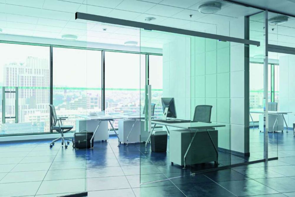 Hersteller von Beschlägen für Raumabschlusstüren in Glas setzen oft ganz auf die Klemmtechnik, bei der die Gläser zwischen zwei Druckplatten gespannt werden. Bei schwereren Elementen kommt noch zusätzlich der Klebstoffauftrag hinzu. Bei Dormakaba arbeitet man mit dieser Kombination. Dem geklemmten Schiebebeschlag wird nach der Montage über die vorgesehenen Zuführbohrungen ein 2-K-Kleber appliziert. Dieser verteilt sich zwischen Glas und Beschlag in den vorgesehenen Hohlräumen. Vorteil hierbei ist, dass die Kraft zum Klemmen relativ gering ausfallen kann, weil durch den Klebstoff eine starre Verbindung hergestellt wird.