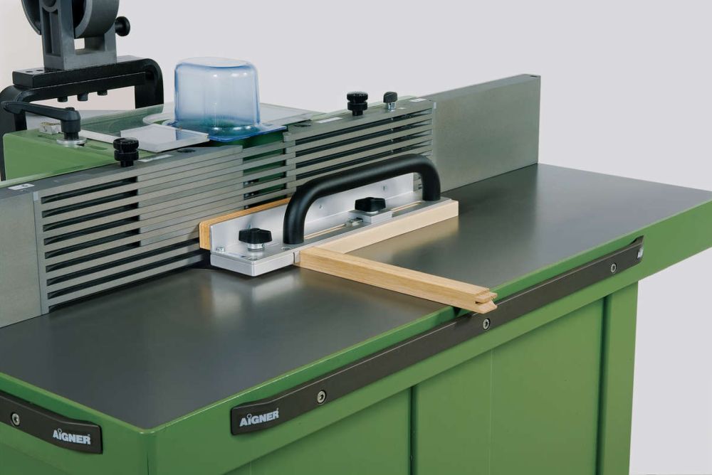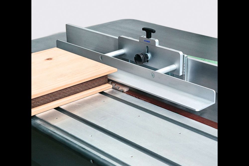 Wer parallele Streifen oder vorstehende Flächen bündig auf der Tischfräse schneiden muss, ist darauf angewiesen, dass der Längsanschlag absolut stimmt und an der Spitze auch nicht nachgibt. Nicht jeder Anschlag schafft das und so gibt es von der Firma Georg Aigner in Bayern eine magnetische Befestigungssäule die für Abhilfe sorgt. Produkte von Aigner werden von jedem Maschinenhändler in der Schweiz und auch von der Suva vertrieben. Dort sollen sich Interessierte auch informieren, denn die Firma führt bewusst keine Internetseite. Georg Aigner reagiert dafür auf Problemstellungen, die von seinen Kunden zu ihm kommen. So entstehen immer wieder praktische Komponenten, wie die Möglichkeit, den Schiebetisch für Fügeschnitte zu nutzen.