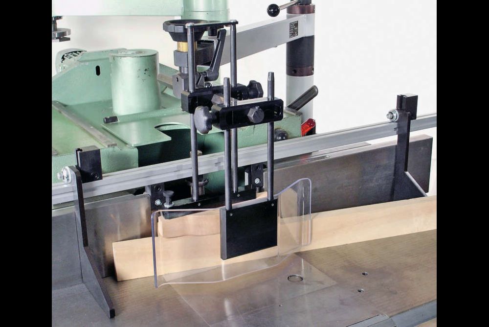 Interessant ist die Vielzahl von Anschlagoptimierungen im geraden Bereich und den sehr verschiedenen Rückschlagsicherungen für abgesetztes Kehlen. Für diese Arbeit gibt es auch spezielle Haltevorrichtungen, die kurze Werkstücke wie bei einer Querbearbeitung eines Schubladendoppels halten können. Eine ähnliche Halterung hilft auch beim Hirnholzkehlen von Leisten. Vorrichtungen, die zur Herstellung von runden Platten dienen, können in der Regel nicht nur an der Kehlmaschine, sondern auch zum Vorschneiden an der Bandsäge und zum Schluss an der Kantenschleifmaschine eingesetzt werden.