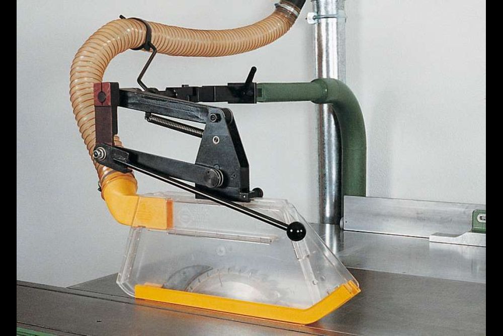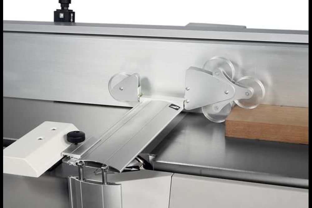 Sämtliche Maschinenhersteller bieten solche Hauben an. Sie bieten ebenso die Möglichkeit des schnellen Wechselns zur breiteren Schrägschnitthaube. Sobald diese montiert ist, weiss der nachfolgende Benutzer, dass der Schnittwinkel nicht 90° beträgt. Ob zwei Rollen oder durchgehende Schienen das Werkstück niederhalten sollen, hat damit zu tun, ob auch dünne Materialien geschnitten werden, die zum Flattern neigen.