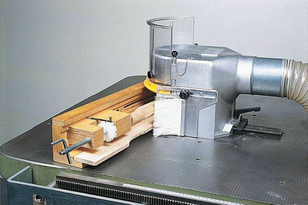 Was hat sich aber in der Zwischenzeit alles verändert und was gibt es Neues zur Vereinfachung? Geräte, die mit dem Werkzeug in Berührung kommen könnten, müssen damit fräsbar sein. Das hat beispielsweise dazu geführt, dass die Suva-Schutzhaube der Tischfräse aus Kunststoff und nicht mehr aus Stahl ist. Durchsichtig wurde sie, damit man immer sehen kann, ob sich ein Fräsenblatt darunter bewegt und welche Stellung es hat.