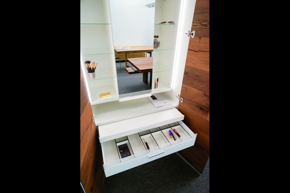 Mit dem Programm «Format3» zeigte Lüönd eine Kollektion, die sowohl im Wohnen, Essen wie Schlafen Korpus-, Regal- oder Schrankkombinationen erlaubt. Beispielsweise verfügt der Kleiderschrank über eine dicke, stabile Rückwand, wodurch er auch als Raumtrenner einsetzbar ist. Bei der Möbelfabrik Betschart wurde das Programm «Nora» gezeigt, das aus unzähligen Korpusgrössen besteht. Diese werden miteinander verschraubt und mit einer durchgängigen, aber demontierbaren Aussenhülle versehen. Die dünnen Seiten- und Blattaufdoppelungen gibt es furniert, farblackiert oder in Glas. Speziell ist auch die partiell wählbare Frontgestaltung mit diagonal verlaufendem Furnier. Der Endkunde kann sich damit fast auf Mass jeden gewünschten Korpus und jede Vitrine zusammenstellen.