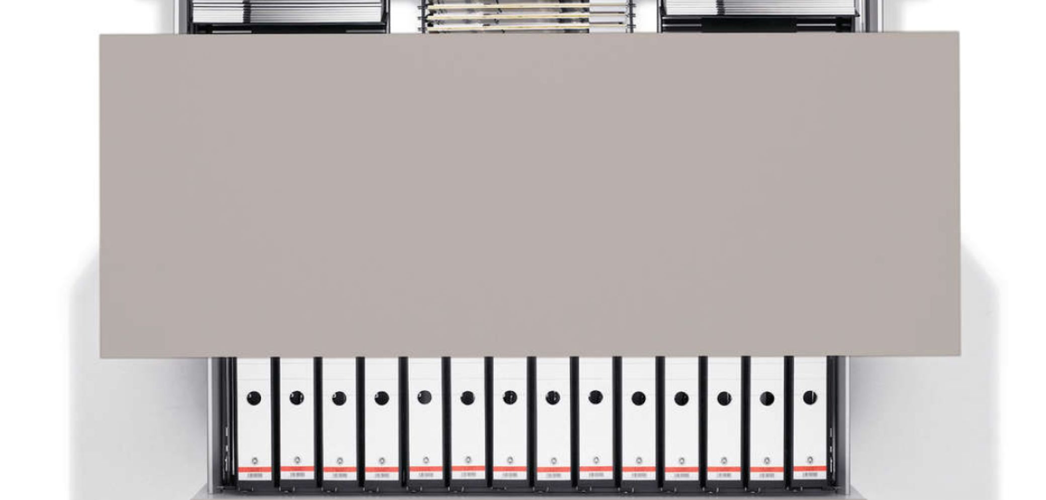 Büroschrank aus der Vogelperspektive: Breit und dann auch noch schwer sind Anforderungen, welchen Beschläge einer Sonderschublade gewachsen sein müssen. Bild: Schock Metall GmbH