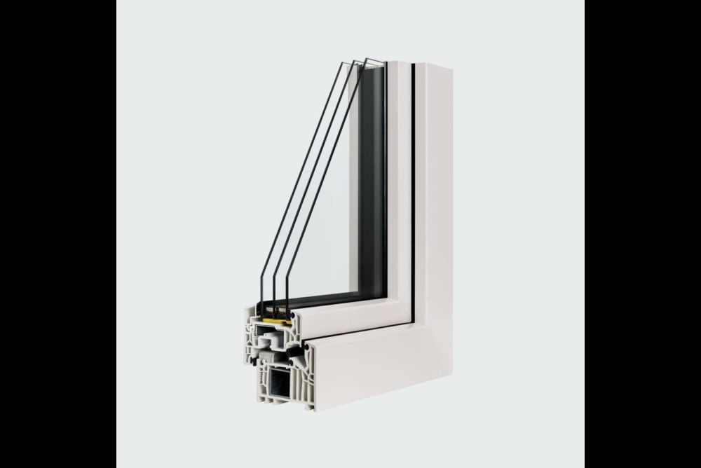 Das System überzeugt zudem mit energetisch guten Spitzenwerten und der schlanken Mittelpartie von 104 mm. Die Rahmenstärke von 82 mm mit sieben Kammern verbessert die Rahmenisolation und ver- längert die Funktionsdauer. Die Fenster können Isoliergläser mit einer Elementdicke bis 54 mm aufnehmen.