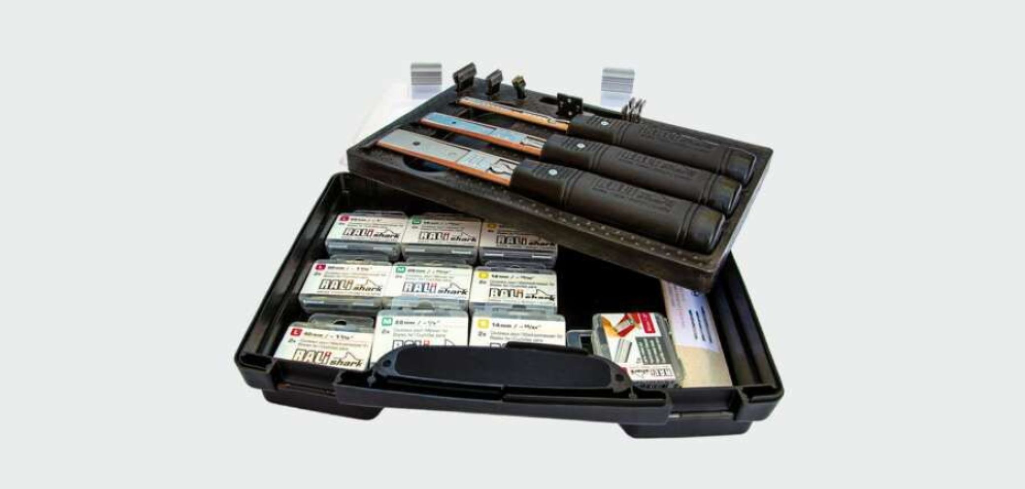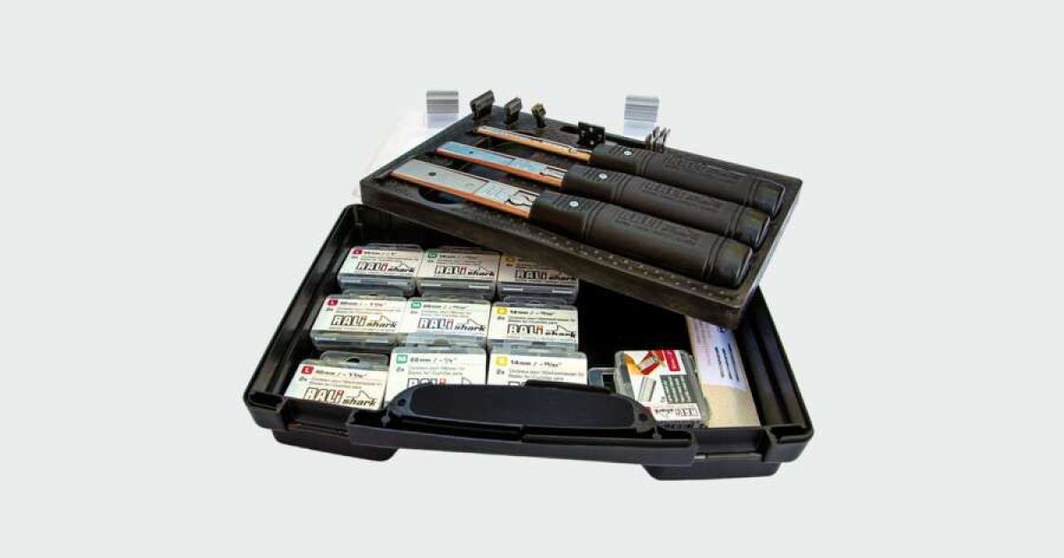 Mit dem «Shark Case Exklusiv» bietet Rali einen Koffer mit 27 Zubehörteilen an. Der Koffer enthält ein Sortiment der Multifunktions-Stechbeitel mit drei Griffen und Wechselmessern in neun Messerbreiten:10, 12, 14, 18, 20, 22, 25, 30 und 40 mm. Die Stechbeitel sind wie konventionelle Holz-Stechbeitel zu verwenden. Wechselmesser sparen Platz und Gewicht im Werkzeugkoffer und bleiben stets einsatzbereit und scharf. Der Messerwechsel erfolgt laut Hersteller in Sekundenschnelle. Die Ersatzmesser sind zudem nachschleifbar. Die Adapter für die zusätzlichen Funktionen Schaben und Sägen werden im Koffer exklusiv mitgeliefert. Die exklusive Variante beinhaltet im Vergleich zum Standard-Koffer mehr Zubehör: Zusätzlich zu dem Schaber, den drei Adaptern für Standard-Stichsägeblätter und den neun Wechselmessern enthält der Koffer je zwei weitere Messer pro Messerbreite, drei Stichsägeblätter «Bosch Professional» (für die Bearbeitung von Holz, Alu und Stahl) und ein Wechselmesser aus Hartmetall (50 mm) für den Schaber.