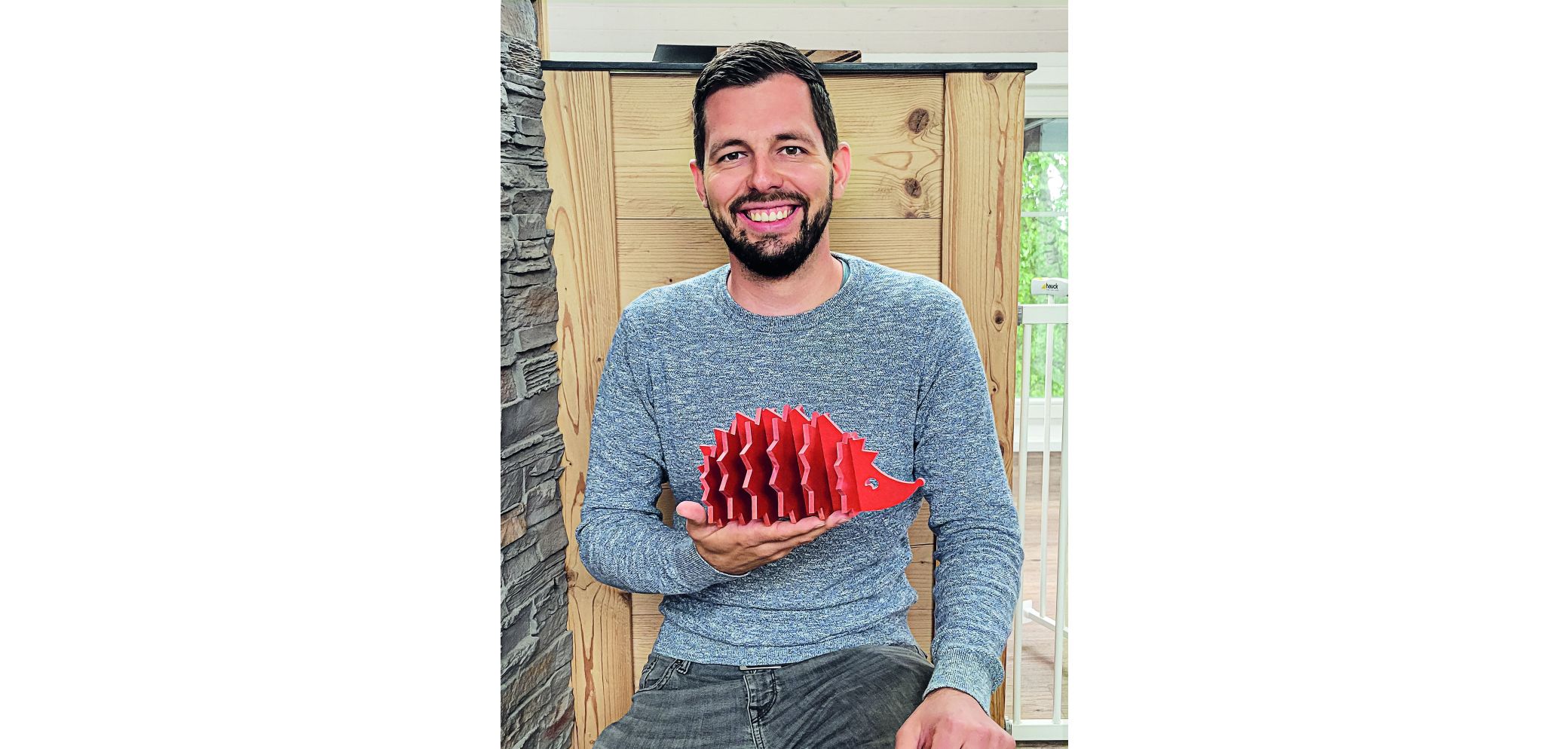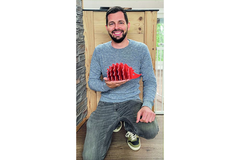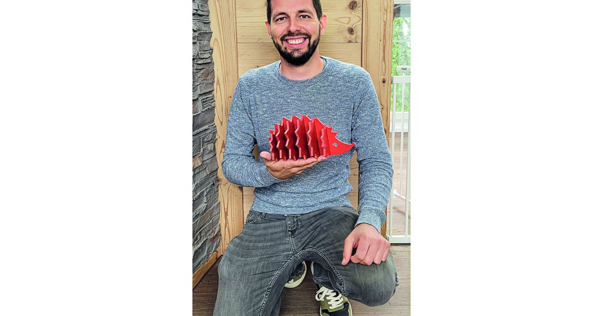 Julian Biland (31) hält eine Lehrlingsarbeit in Händen, das die Schreinerei Blatter auch als Kundengeschenk einsetzt. Bild: Fränzi Hurni