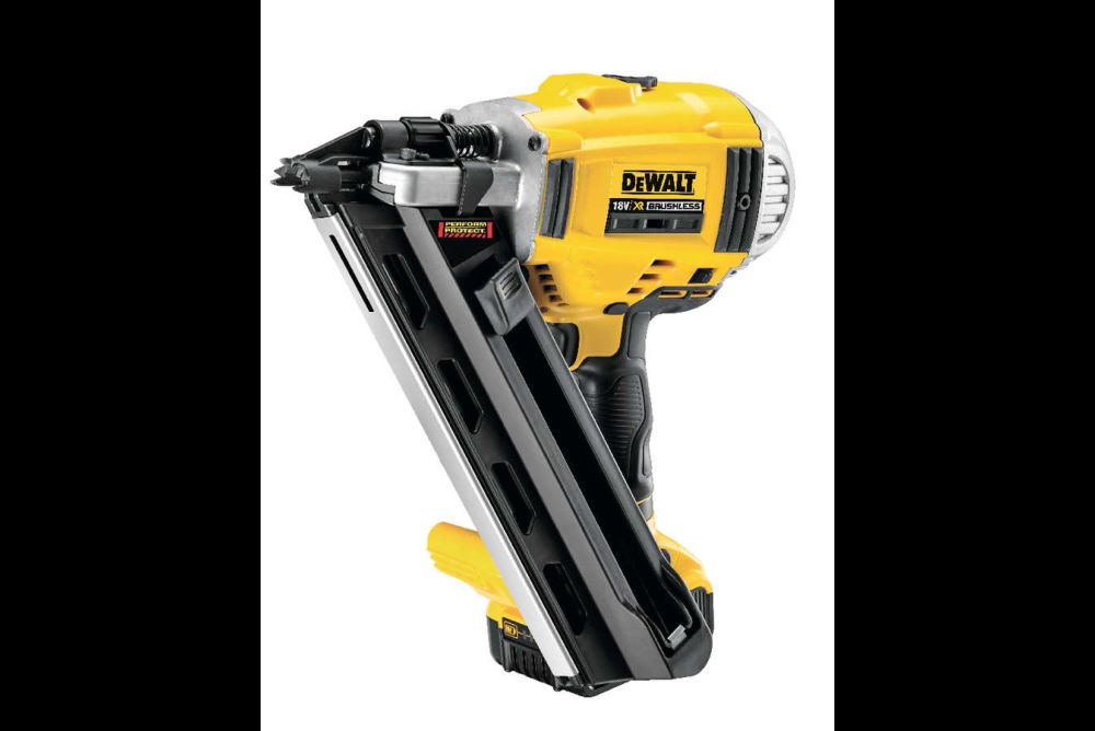 Für eine höhere Arbeitsleistung pro Akku-Ladung und eine längere Gerätelebensdauer hat Dewalt jetzt den 90-mm-Akku-Nagler mit Zweistufen-Elektronik lanciert. Je nach Nagellänge und Material lässt sich mit dem 18,0-Volt-Gerät «DCN 692 P2» die Drehzahl und damit die Einschlagenergie zweistufig anpassen. In der ersten Stufe reduziert die Elektronik nicht nur die Drehzahl auf 11 000 U/min, sondern auch die Einschlagenergie, um 50- bis 70-mm-Nägel in das Material zu treiben. Dadurch erhöht sich die Anzahl der Schüsse. Möglich ist das Einschlagen von 2 Nägeln pro Sekunde und bis zu 1250 Schüsse pro Akku-Ladung. Für das Eintreiben langer Nägel bis 90 mm in Weichholz wiederum beschleunigt der Nagler in Stufe 2 auf 13 000 U/min und gibt eine Einschlagenergie von 105 Joule frei. Trotz höherem Energieaufwand ge- währleistet dann der 5,0-Ah-XR-Akku eine Laufzeit mit bis zu 750 Schüssen pro Ladung. Die kohlebürstenlose Motorbauweise verbessert zusätzlich den Wirkungsgrad.