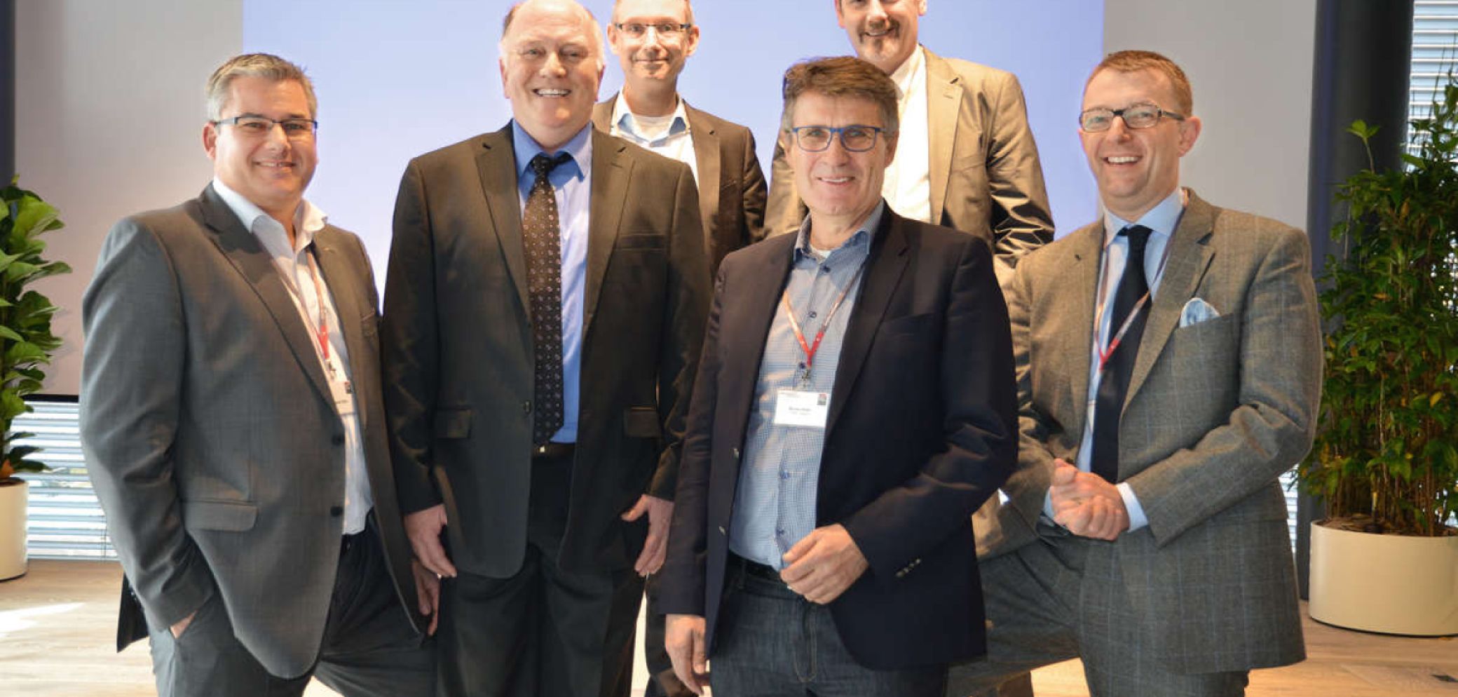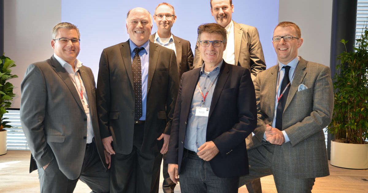 Rainer Klein (links), Geschäftsleiter von Küche Schweiz, und die Referenten freuen sich über den gelungenen Anlass. Bild: SZ, Monika Hurni