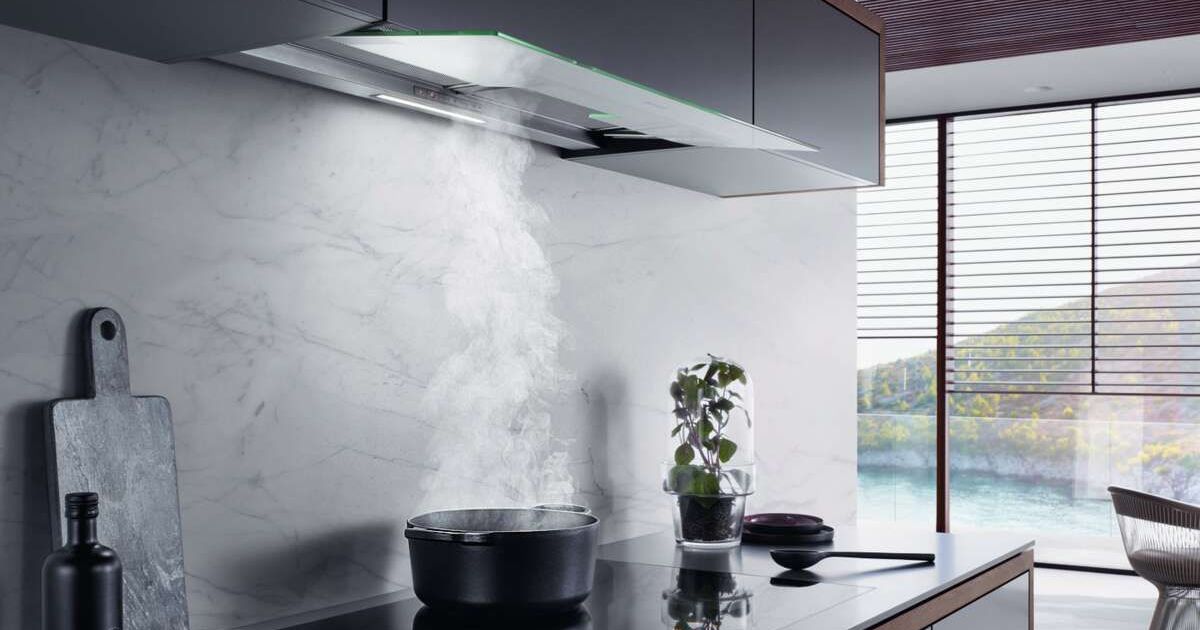 Die Spitzenmodelle «DAS 8630» und «DAS 8930» verschwinden komplett im Schrank und sind erst beim Herausziehen der 600 bzw. 900 mm breiten Paneele sichtbar. Eine Mulde an deren Unterseite sorgt für einen sicheren Griff und leichtes Hervorziehen. Je nach Modell werden die Hauben an der vorderen Kante entweder intuitiv per Touch auf einem schwarzen Glasstreifen oder mit Tipptasten bedient. Dabei