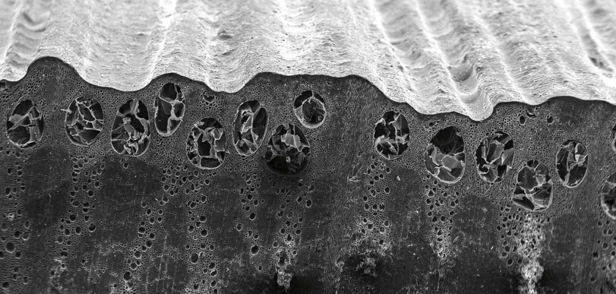 Die Oberfläche von gebürstetem Eichen-parkett unter dem Mikroskop. Bild: Holzforschung Austria