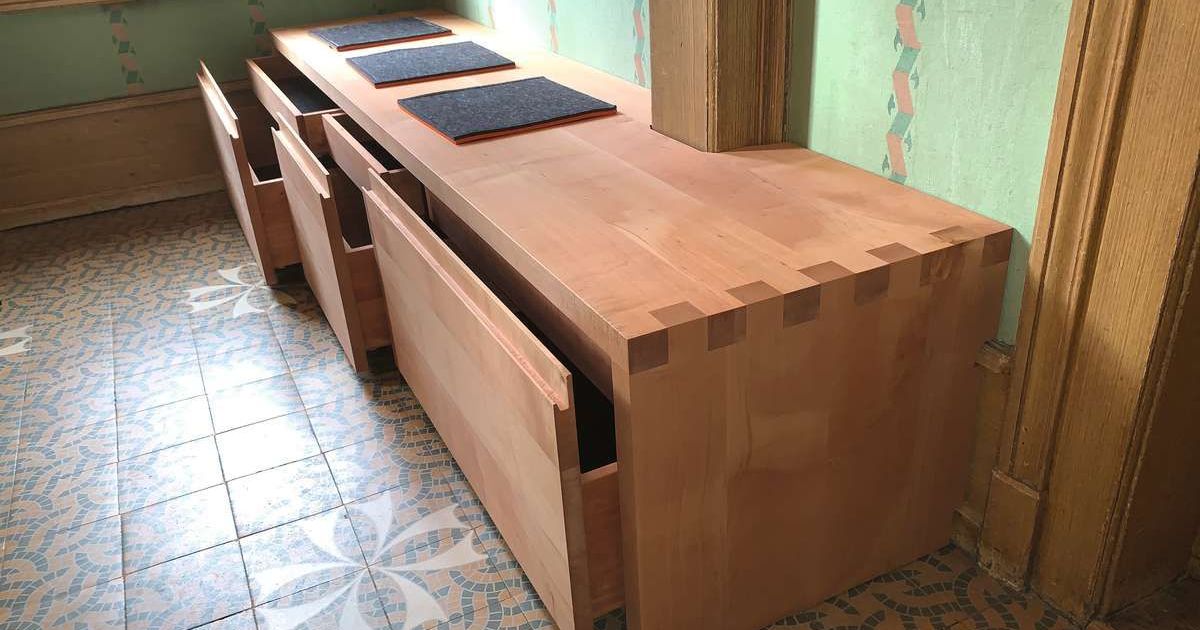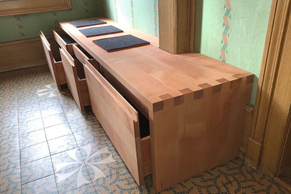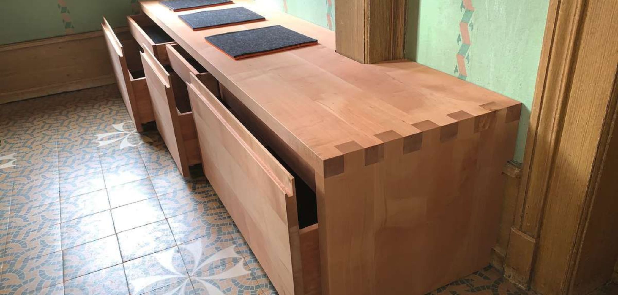 Der Kunde hatte genaue Vorstellungen. Er wollte unbedingt Birnbaumholz. Doch das ist derzeit nicht leicht zu bekommen. Zuerst hat ihm die Farbe des Holzes nicht gefallen. Wir haben aber eine Lösung gefunden, die ihm zusagt: Die Schubladen sind nun röter, und das Überholz ist weisser.