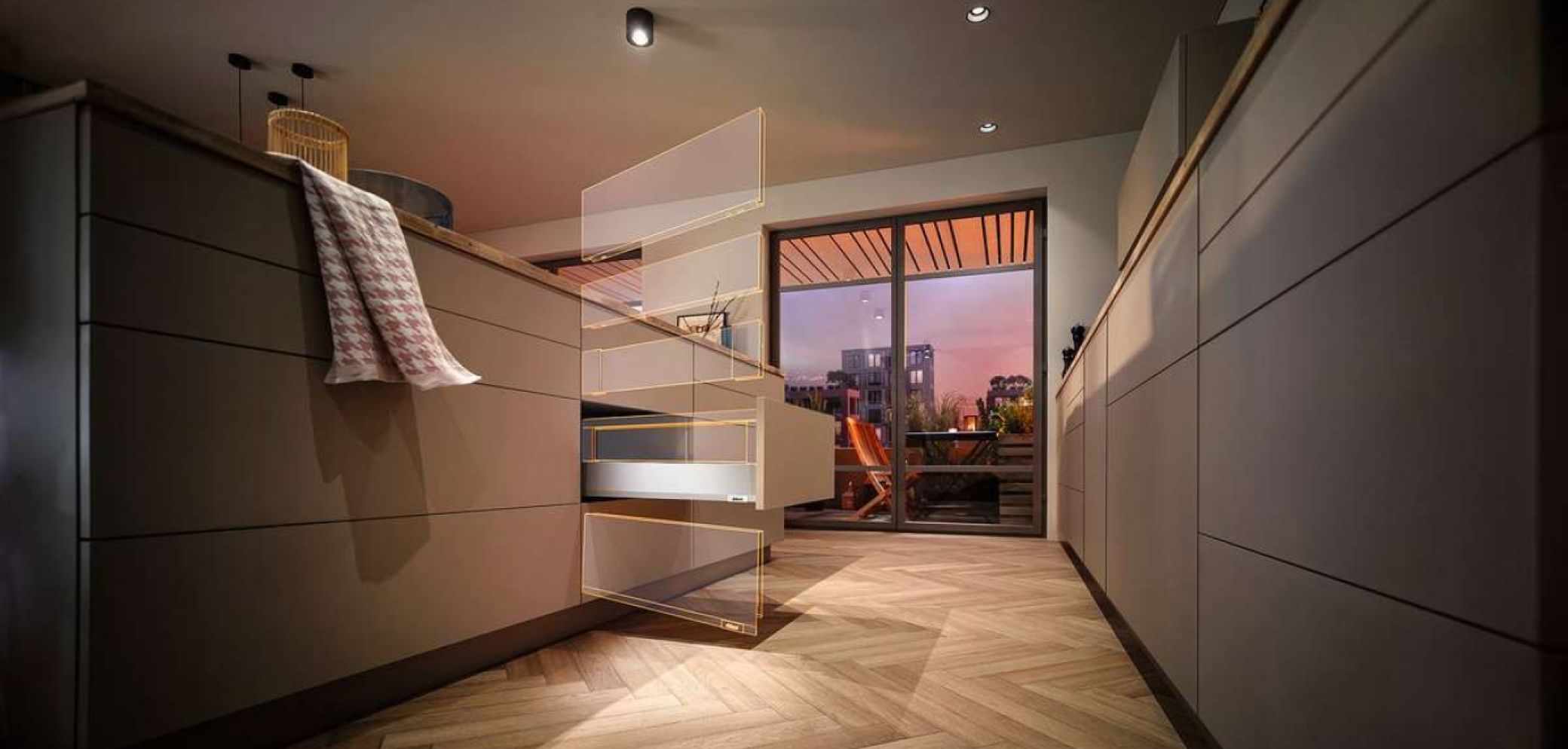 Blum hat mit «Merivobox» bei Schubladen kompromisslos den Plattformgedanken umgesetzt. Damit bieten Schreiner ihren Kunden ein vielfältiges Auszugsprogramm auf der Basis eines einzigen Boxsystems. Egal welche Auszugsvariante: Die Verarbeitungsschritte bleiben dabei immer einfach und Einstellung sowie Montage immer gleich. Der Plattformgedanke steht beim neuen System im Mittelpunkt. Eine Korpusschiene mit nur einer Anschraubposition für alle Anwendungen bildet das Herzstück. Das Führungssystem sorgt durch seine besondere L-Form für hohe vertikale Stabilität und Belastbarkeit.