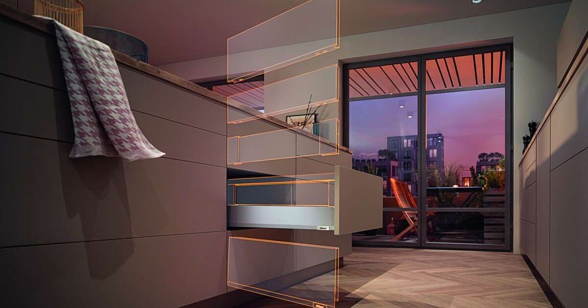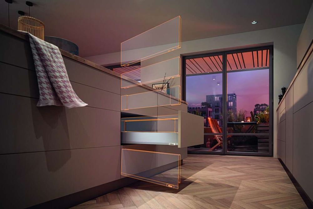 Mit Merivobox hat Blum ein neues Konzept entwickelt, mit dem Möbelhersteller metallische Auszüge variabel gestalten können. Das Boxsystem mit dem Plattformgedanken ermöglicht verschiedene Zargenvarianten bei gleichbleibender Verarbeitung und Montage: Mit Reling, Boxcover mit Einschubelement oder metallisch geschlossen mit Boxcap in Seidenweiss matt sowie Indiumgrau. Die Basis der Plattform ist die Korpusschiene mit nur einer Anschraubposition in Höhe und Tiefe für alle Anwendungen. Der Korpus wird immer gleich gebohrt und die Möbelhersteller können im Anschluss entscheiden, welche Lösung verbaut werden soll. Es ist keine Bearbeitung des Schubladenbodens notwendig und die Bohrposition der Front sowie die Frontbefestigung bleiben immer dieselben. Die Box-Plattform verfügt über einfache und leicht zugängliche dreidimensionale Einstellmöglichkeiten. So entsteht mit wenigen Handgriffen ein einheitliches Fugenbild. Mittels Schnittstellen für Zusatzkomponenten lässt sich das System auch noch später mit Bewegungstechnologien − wie Blumotion, Servo-Drive oder Tip-on-Blumotion − sowie einer Seitenstabilisierung ausstatten. Das neu entwickelte Führungssystem von Merivobox sorgt durch die L-Form für hohe Stabilität und Belastbarkeit von 40 und 70 kg.