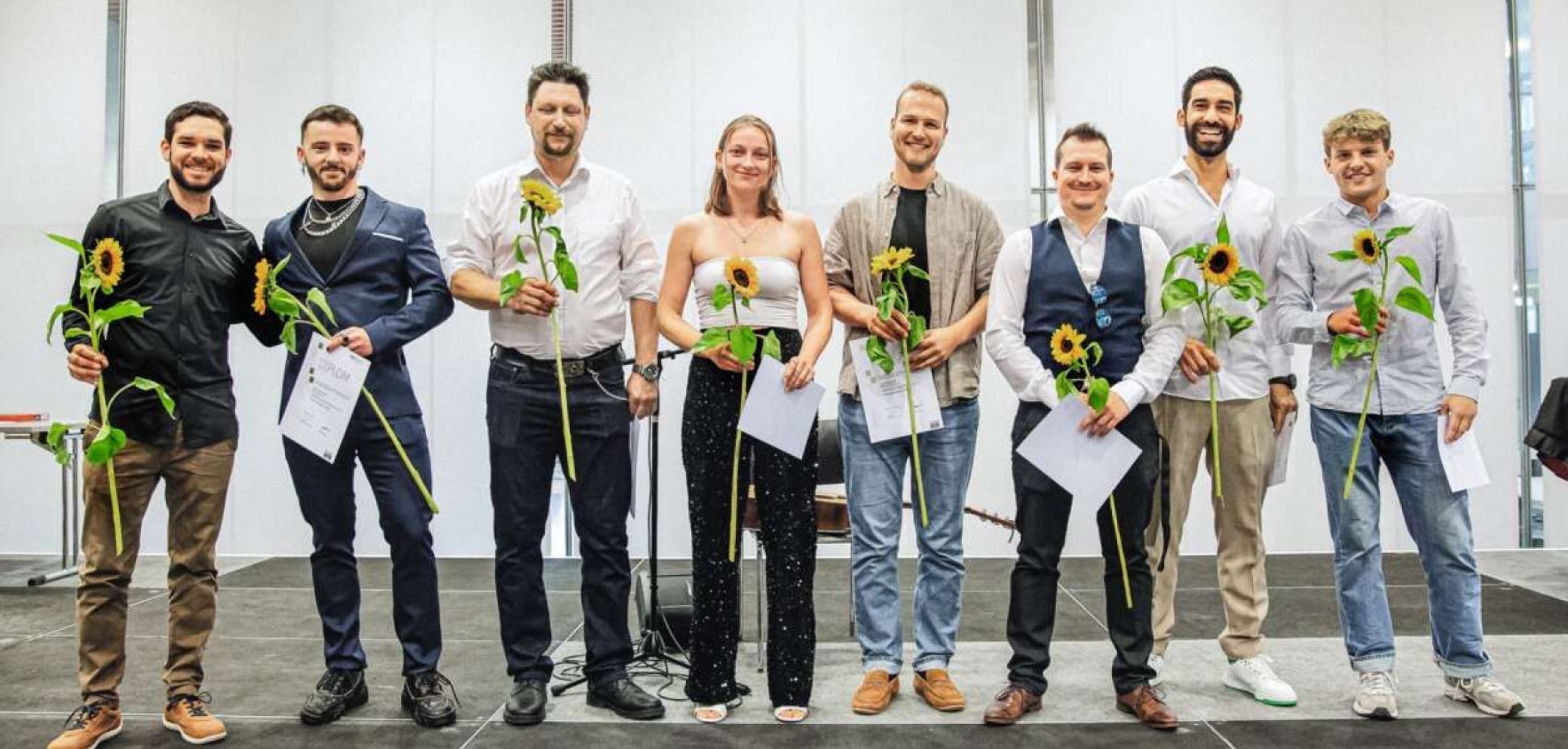 Mit Sonnenblume und Diplom: die acht frisch-gebackenen Fertigungsspezialist/innen in Winterthur. Bild: Chantal Kunz