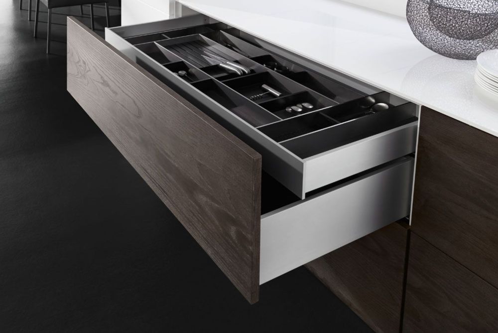 Das Schubkasten-System Vionaro kann auf demselben Unterflur-System aufgesetzt werden wie ein Holzschubkasten: ein zusätzlicher hoher Nutzen für den Kunden, der mit einer Führung völlig unterschiedliche Preis- oder Designlinien bedienen kann. Und der Einbau im Möbel ist – getreu der Maxime von Grass, dem Verarbeiter stets grösstmöglichen Komfort zu bieten – denkbar einfach.